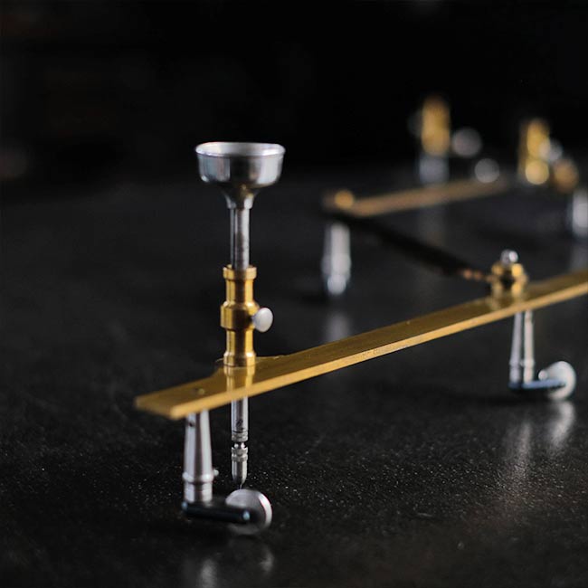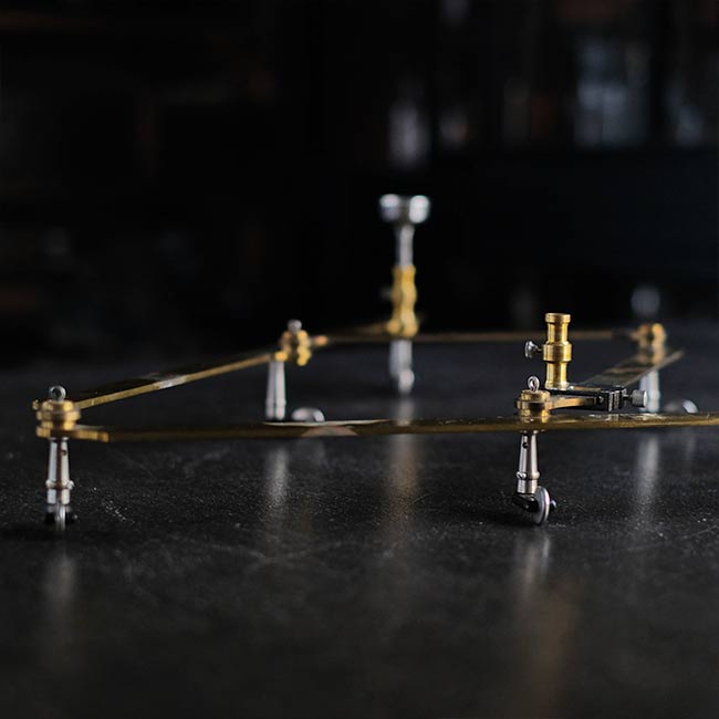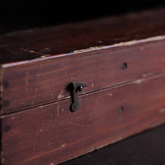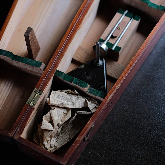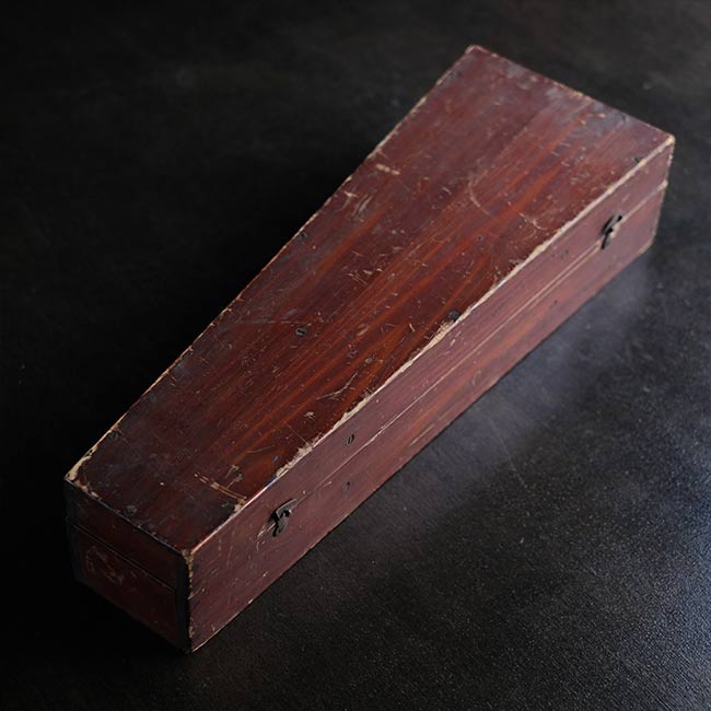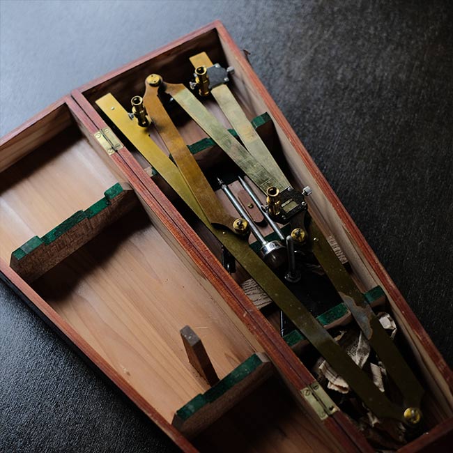 本体は真鍮製で、木箱に収められています。ペン先や台座(使い方不明)、替芯(古新聞にくるまっています)が付属。木箱には傷などが残ります。またパンタグラフにはサビやくすみが見られますことをご了承下さい。木箱にはマイナスネジが使ってあるので、かなり古いものと想像します。