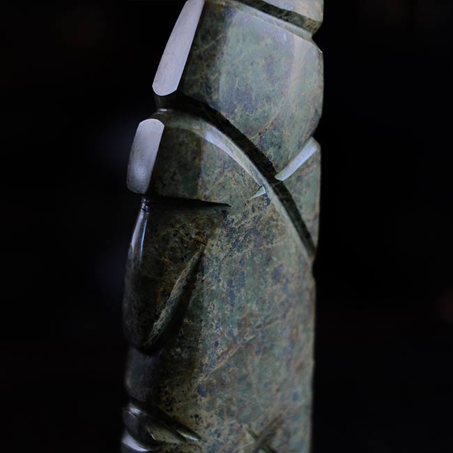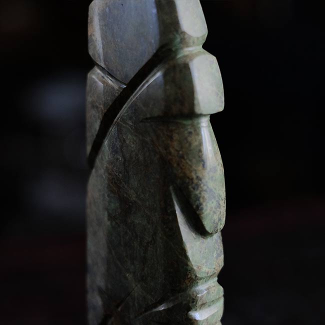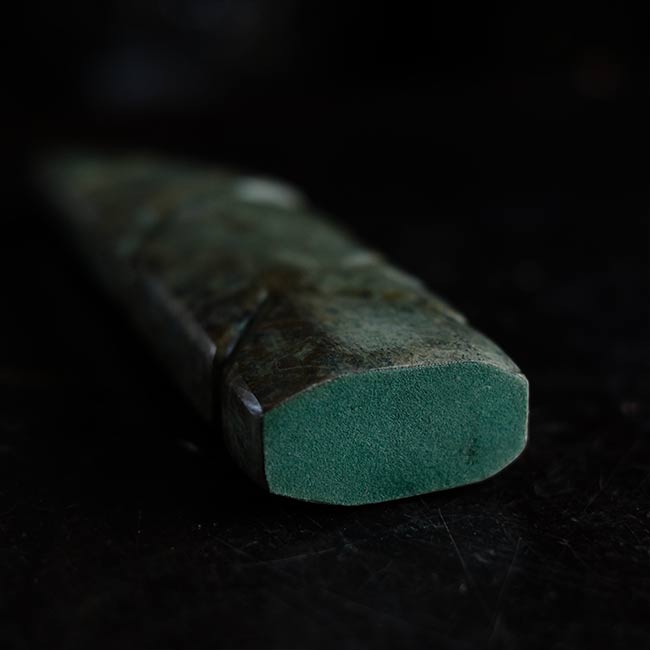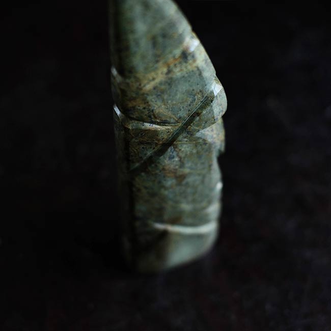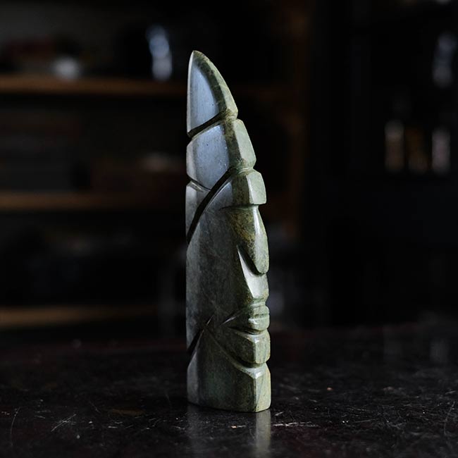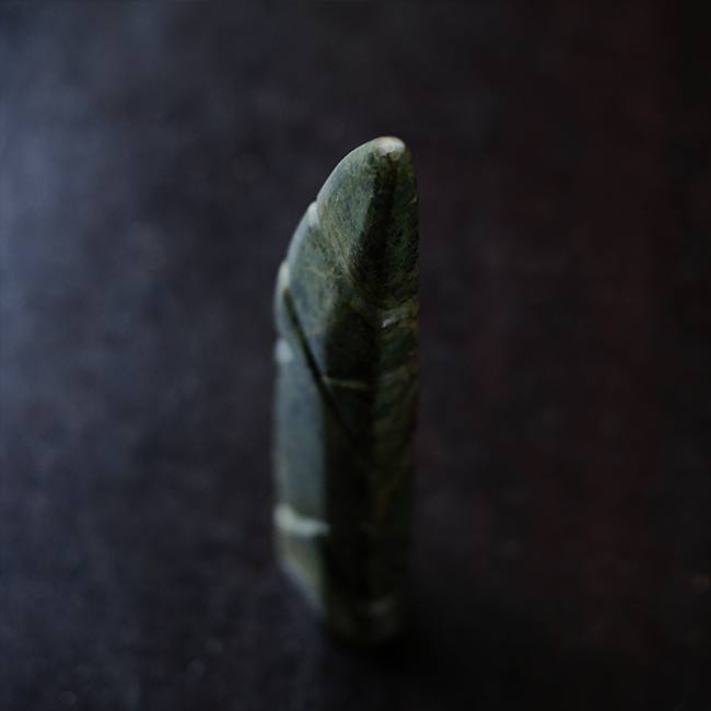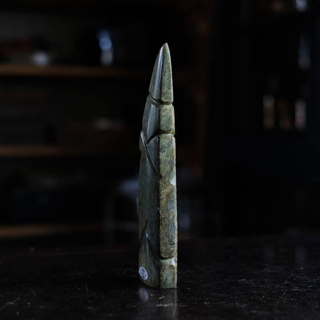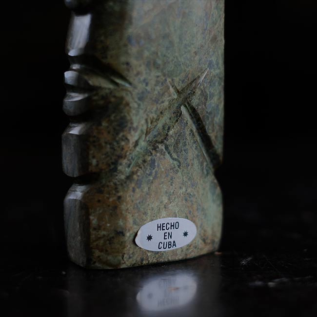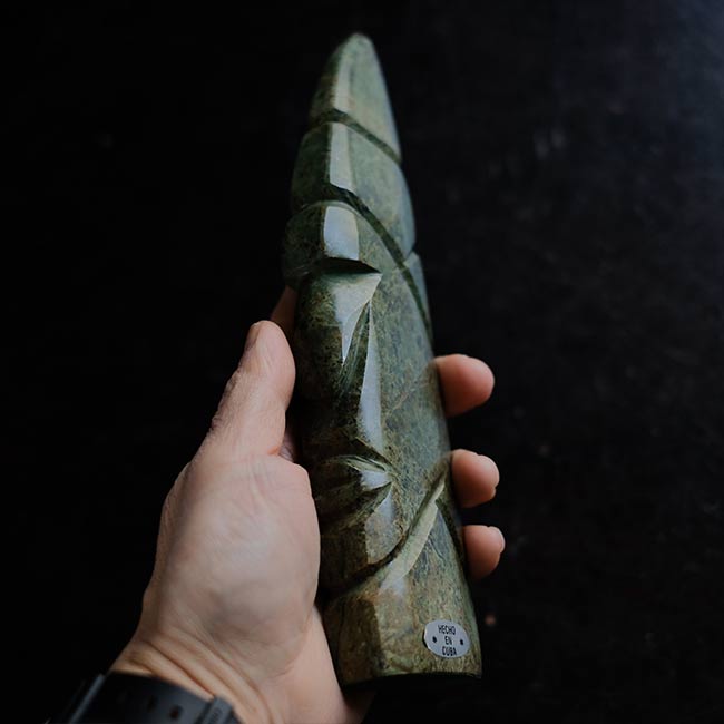 The item has a Cuban label, suggesting it is a Tanoy or Native American sculpture. It has a distinctive knife-like shape and is likely made of agate or jasper. Its base color is green, with various patterns of gray and orange.