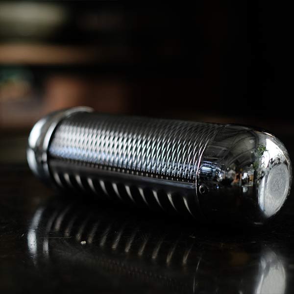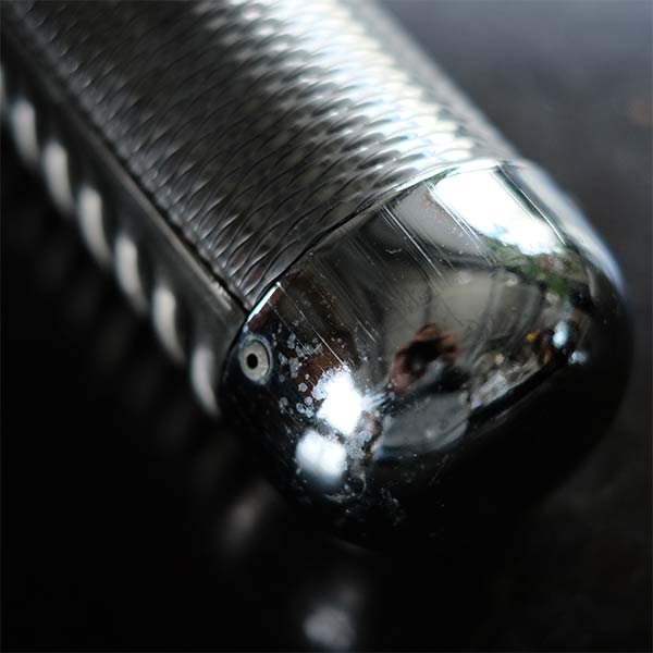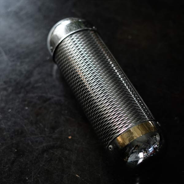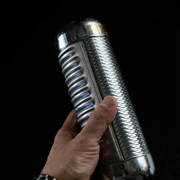 This instrument is thought to be a guiro/maraca, with stone or other particles stuffed inside a metal tube. The sides have two different textured patterns, and rubbing them changes the tone. By slowly tilting the body, it also produces the sound of waves, making it a very enjoyable instrument. There are some small scratches and granular stains, but the damage is not severe.