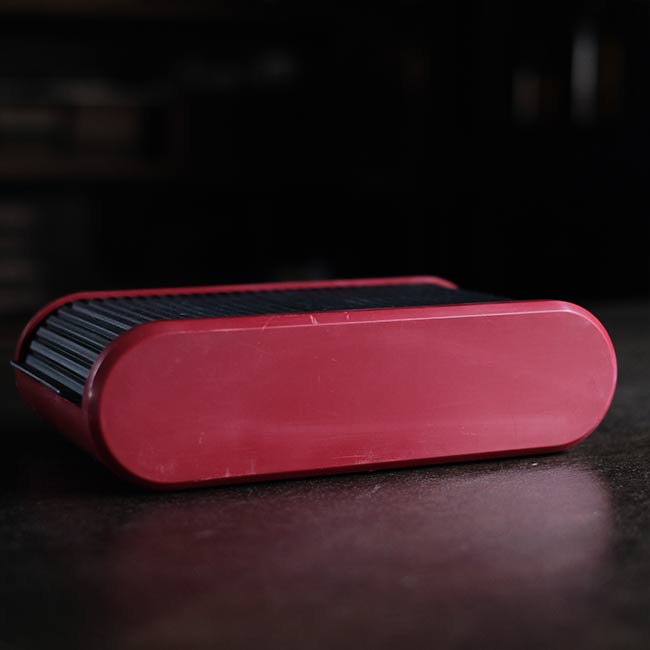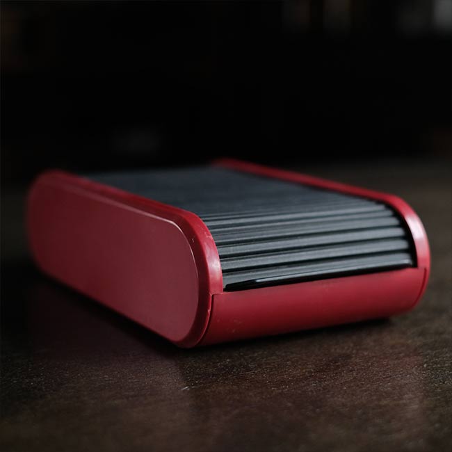 サイズ的には名刺が多少ゆとりをもって収まるくらい。小キズや落とせないシミが少し見られますが、ひどいダメージではなく、蓋の開閉もスムーズです。