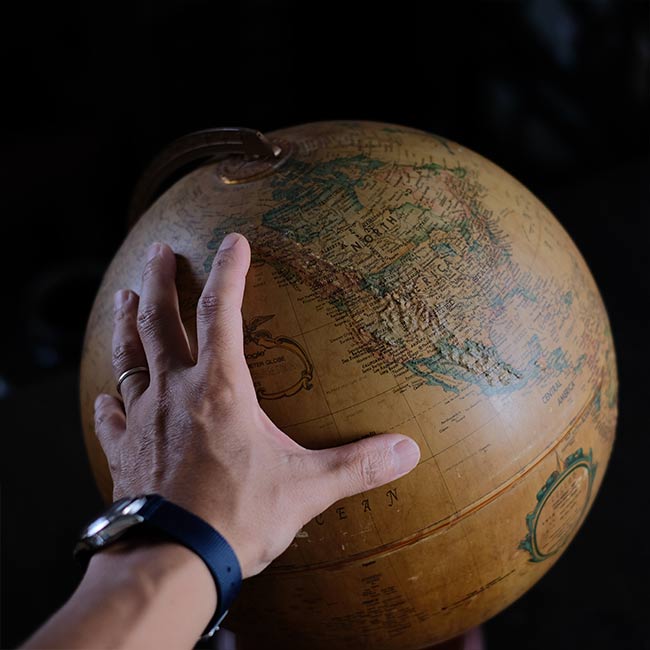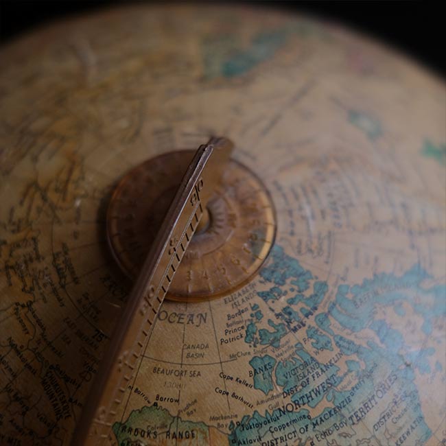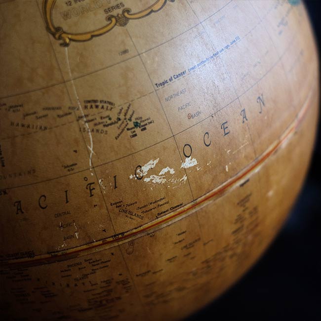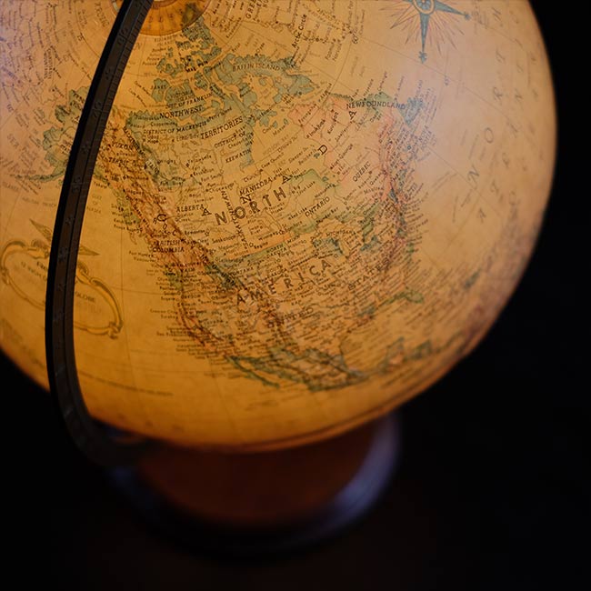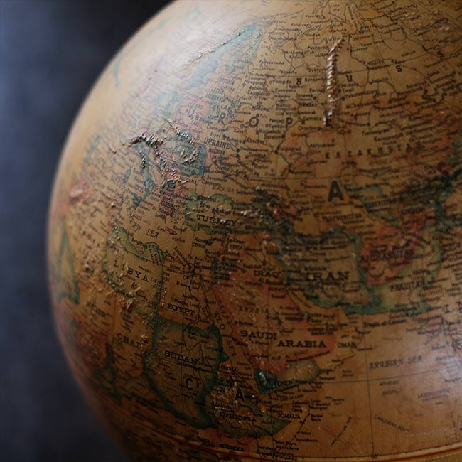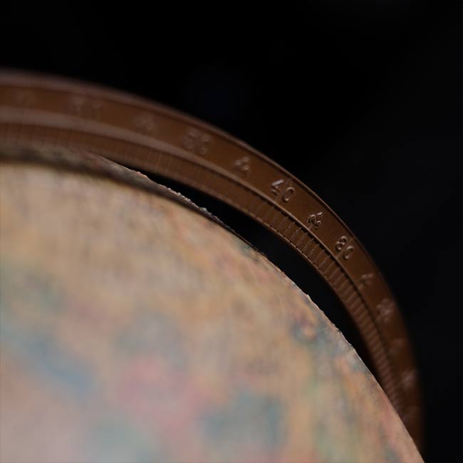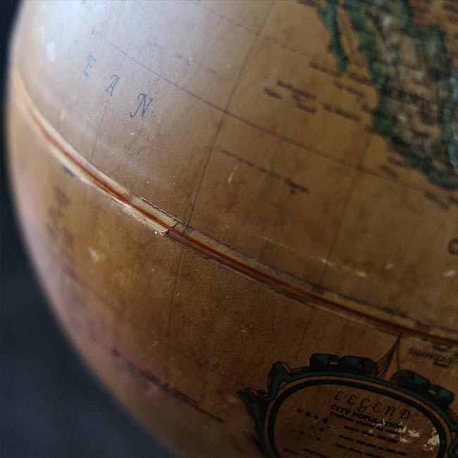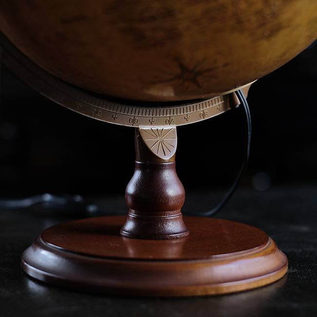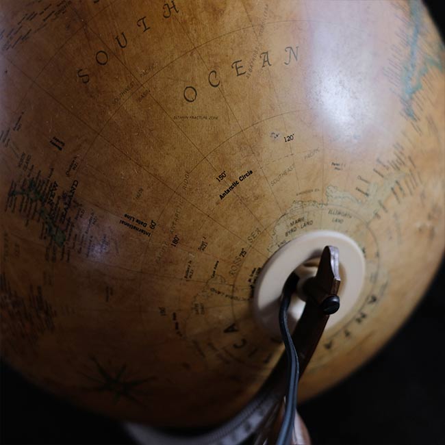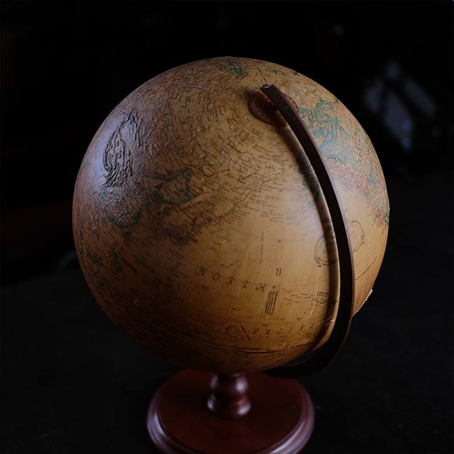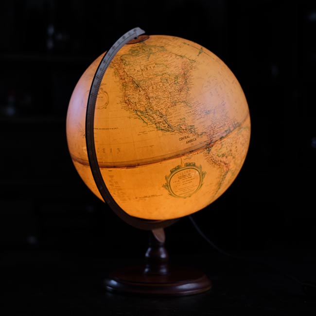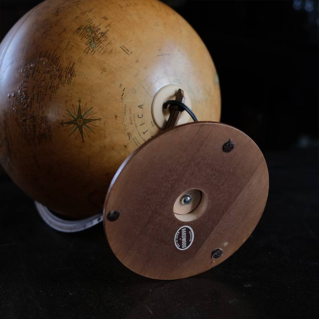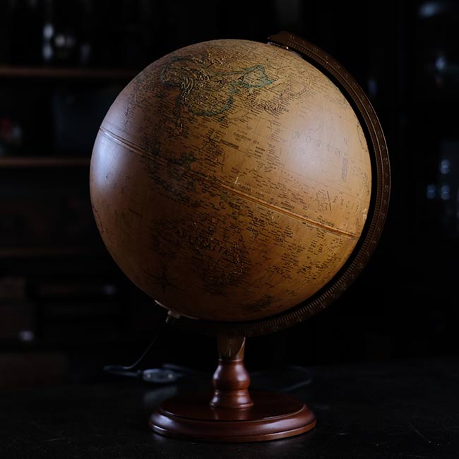 直径30cmほどのアメリカはリプルーグル社のライト付き地球儀になります。日焼けしたような飴色をしていますが、元からなのだろうか。点灯していない状態でもかなりいい色です。