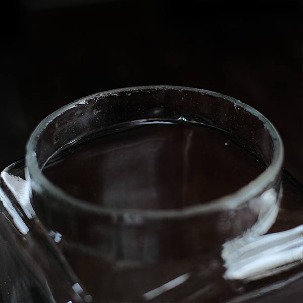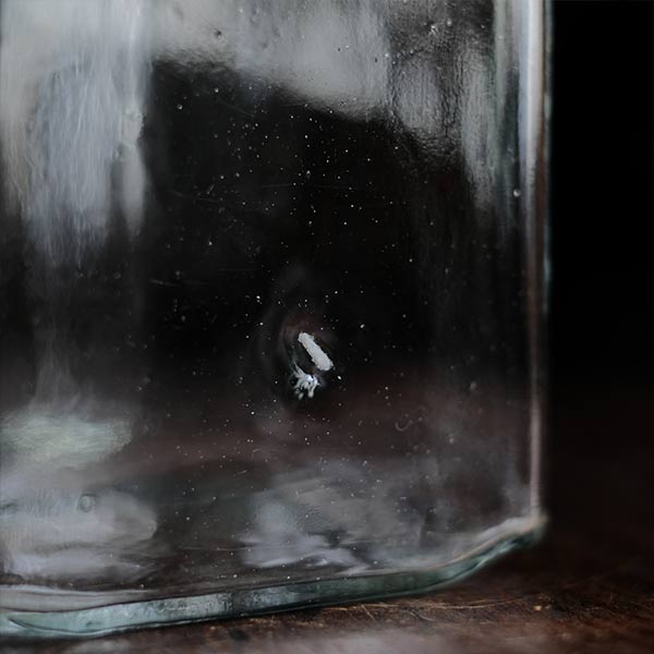 It's a rectangular, rather slender bottle. It may look ordinary, but it's quite elaborately crafted, with a stepped shoulder below the mouth and chamfered corners at the bottom. There are also bubbles, wrinkles, and impurities visible in the glass, giving it a nice texture.