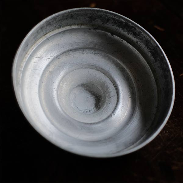 In terms of condition, there are small scratches, some stains, and a chipped edge, but the damage is not severe and the bottle is generally in good condition. The aluminum lid is dull and has some dents, but the surface has been polished.