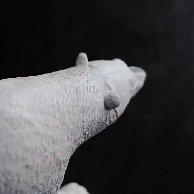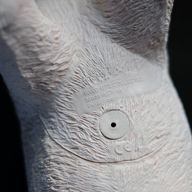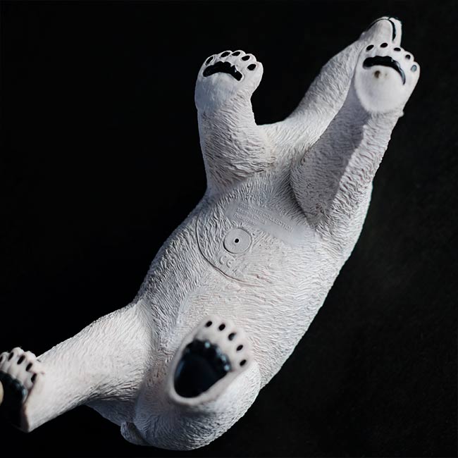 体長32cmほどありますが、わりと軽いシロクマの人形。素材はゴムっぽいですが、ビニールなのだそうです。わりとやわらかく、押すと底の穴からシューシュー音がします。