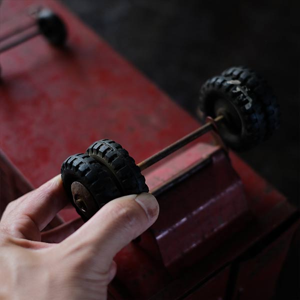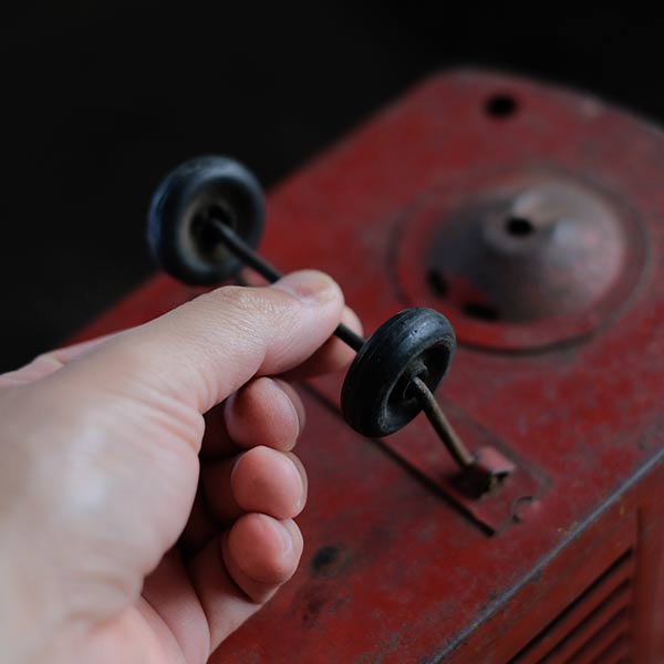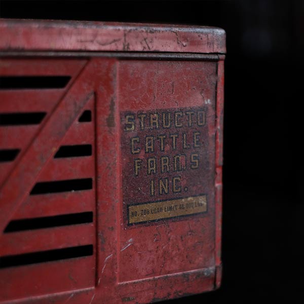 It is modeled after a livestock transport vehicle and the label reads "STRUCTO CATTLE FARMS INC." It appears to be from the 1950s and has scratches and rust. There were originally two sets of rear wheels, but one is missing. Although it is in bad condition, it still has an excellent appearance.