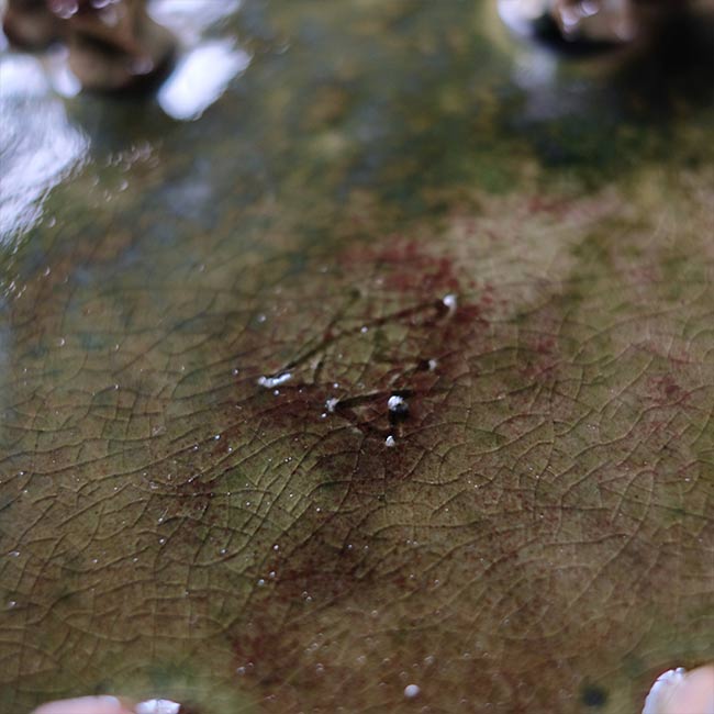 水盤として実際に使っていたような傷は見られませんが、青い釉薬の部分はツヤがありません。底に銘が入っていますが、詳細はつかめませんでした。