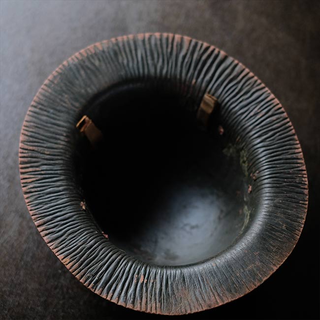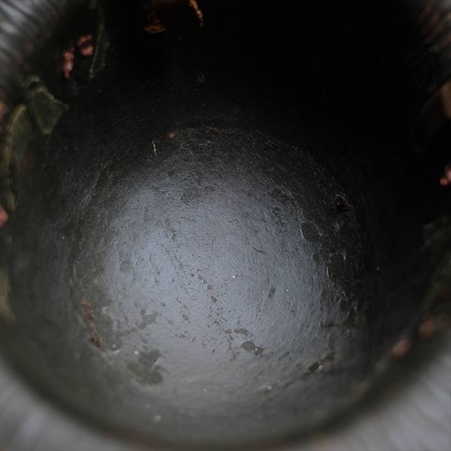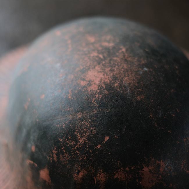 The color is olive green, but the paint has peeled off in places, revealing the dark red base. It is about 60cm in size and has a stretched form.