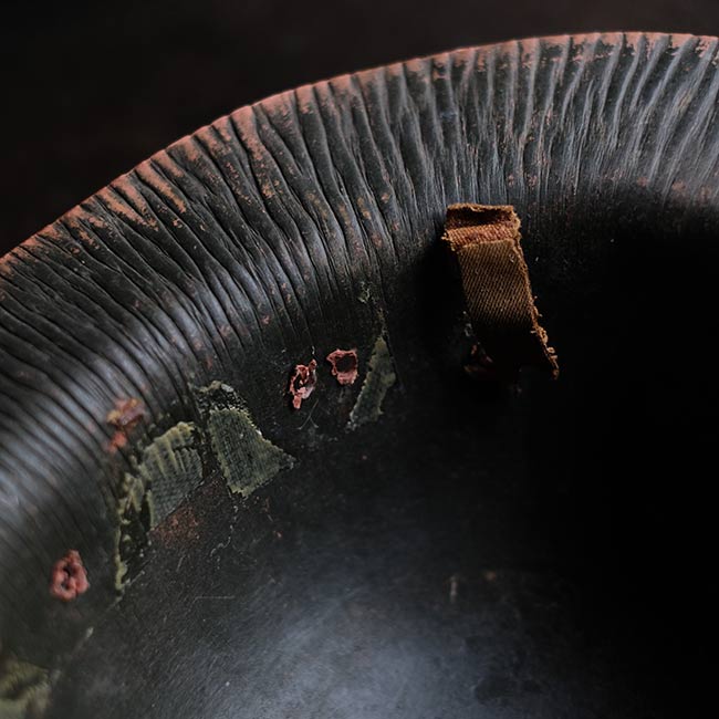 This is a paper helmet made during World War II when supplies were scarce. It is made of a specially processed hard paper material similar to a crate box, and is hard enough that it won't be crushed by hand.