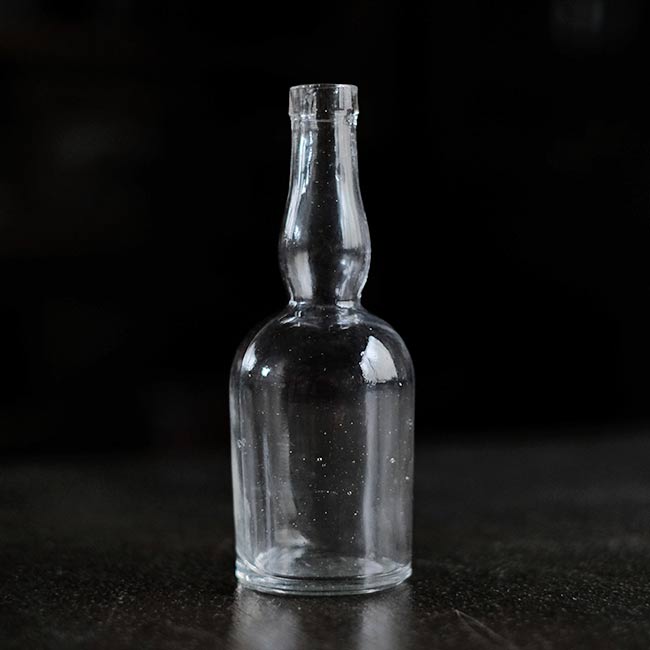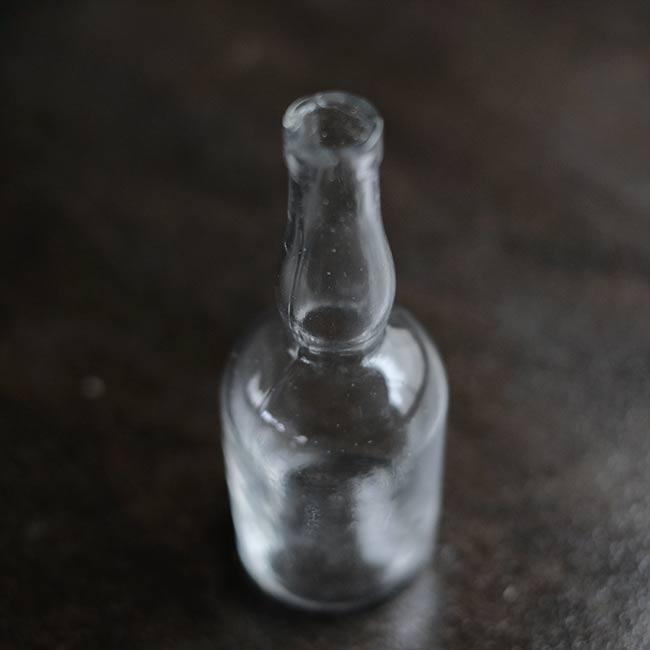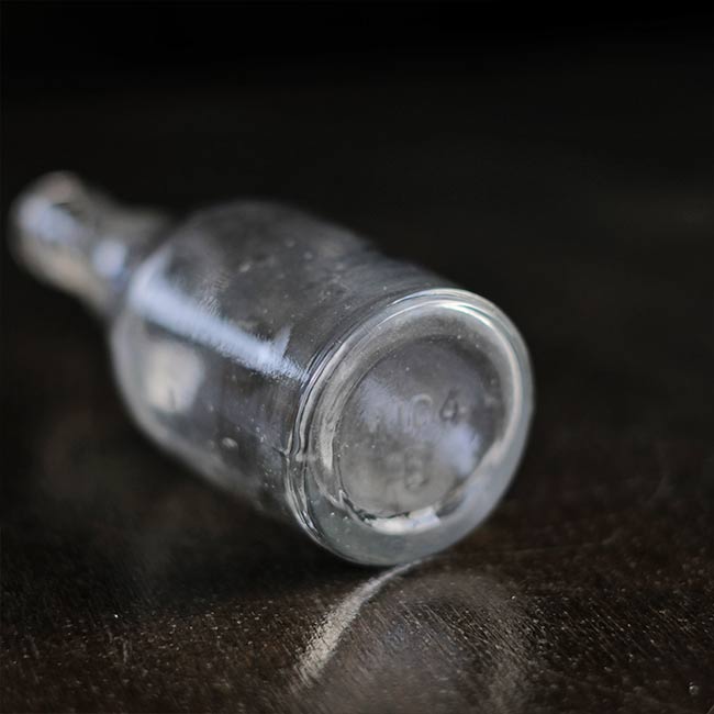 底に「1104 B」と入っていますが、なんの瓶なのかはわからず。結構古い日本のものと思っていますが、首の途中が太く膨らんでいて、ガラス内には細かい気泡が見受けられます。
