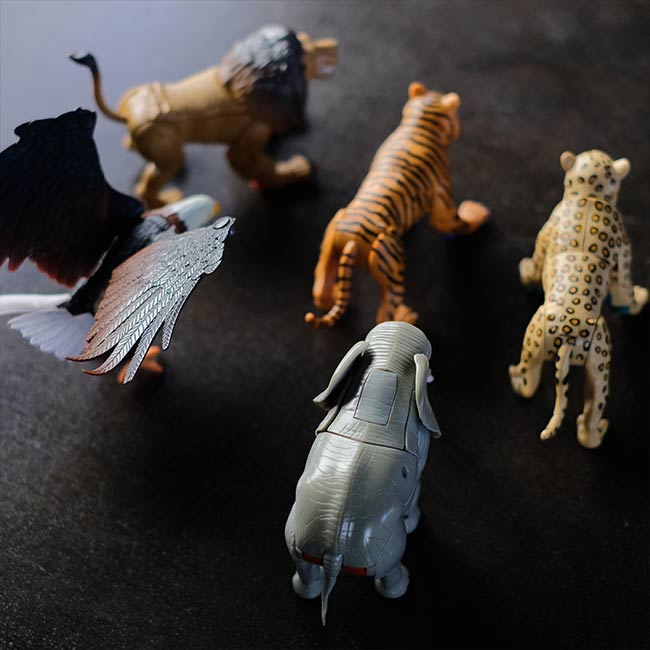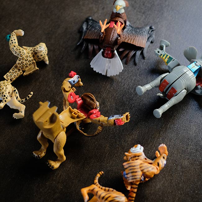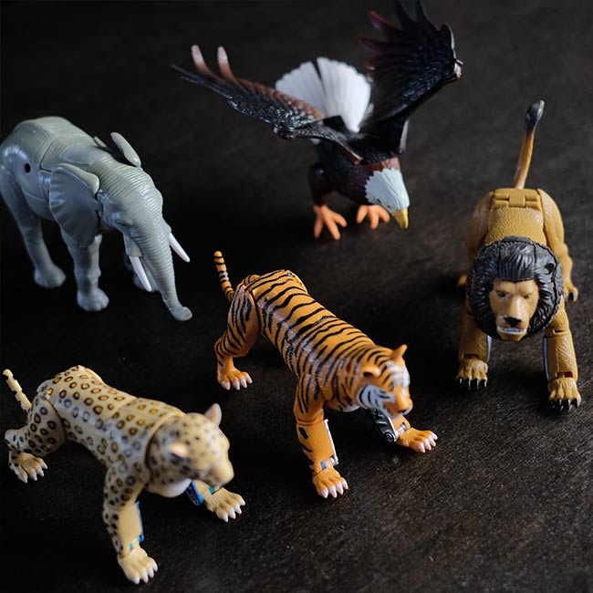 1977年創業のおもちゃメーカー、ザ・アクセスの大ヒット商品、アニバトロン。そのパートⅥの中から、ヒョウ、タイガー、ライオン、アフリカゾウ、ワシの5体をセットにして。