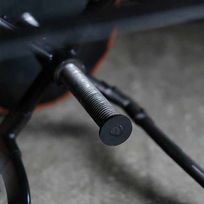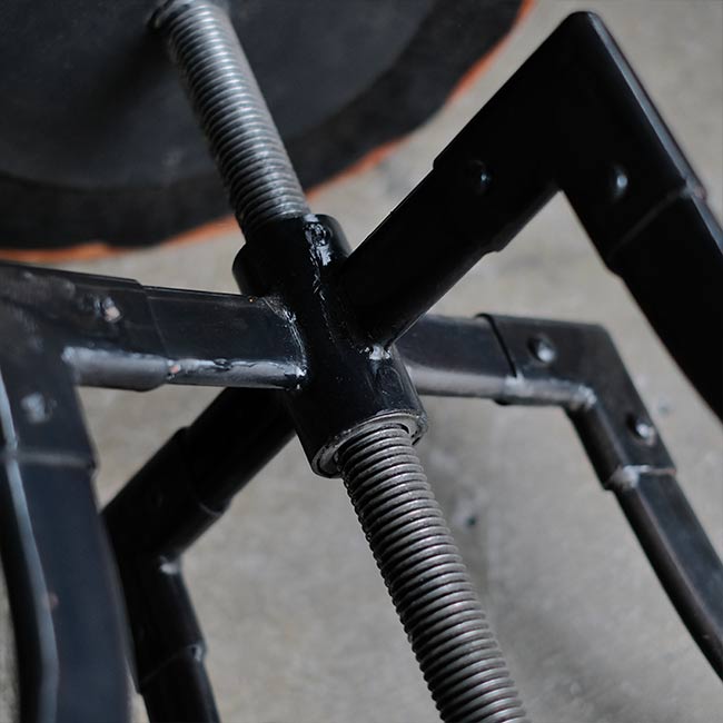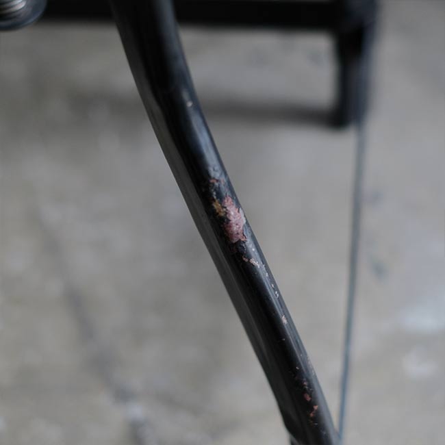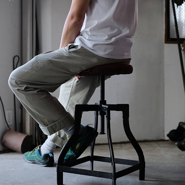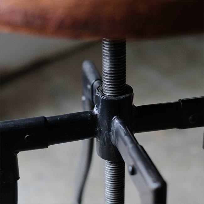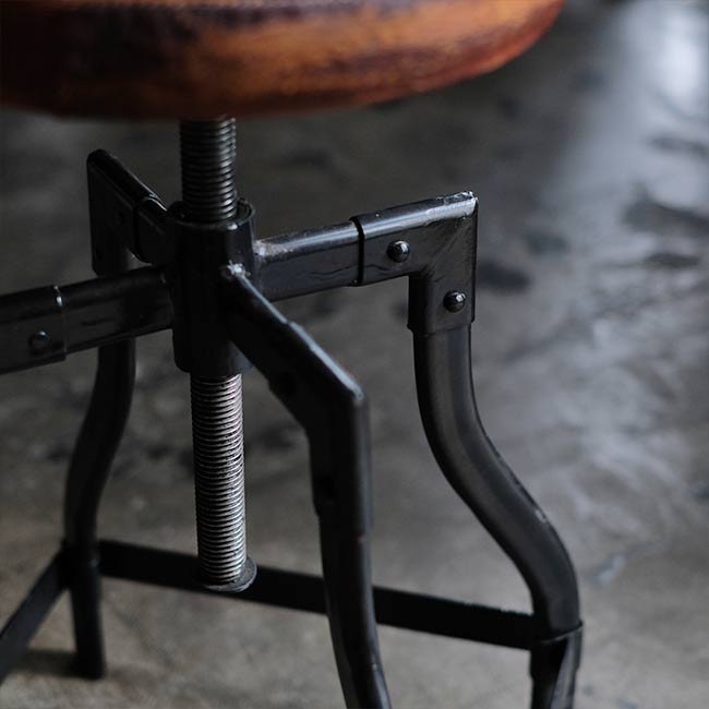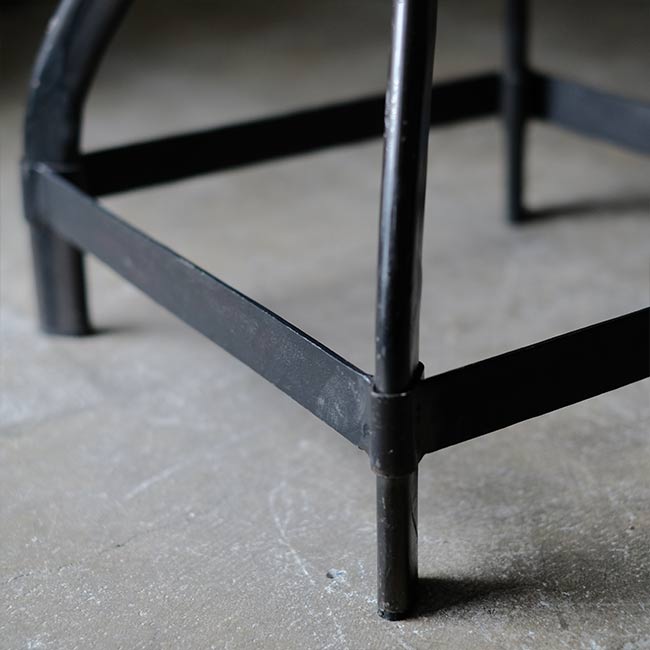 座面を回転させることで高さ調節ができまして、一番低くした場合は少し高めのダイニングチェア、一番高くするとハイスツールになります。高くしても、この手のスツールとしてはぐらつきは少なめです。なお脚には傷や塗装の剥がれ、サビが見受けられますことをご了承下さい。