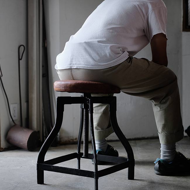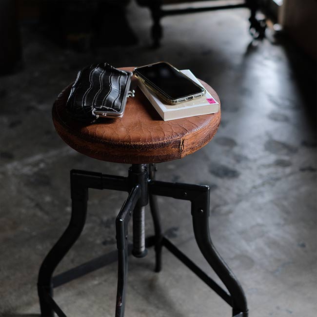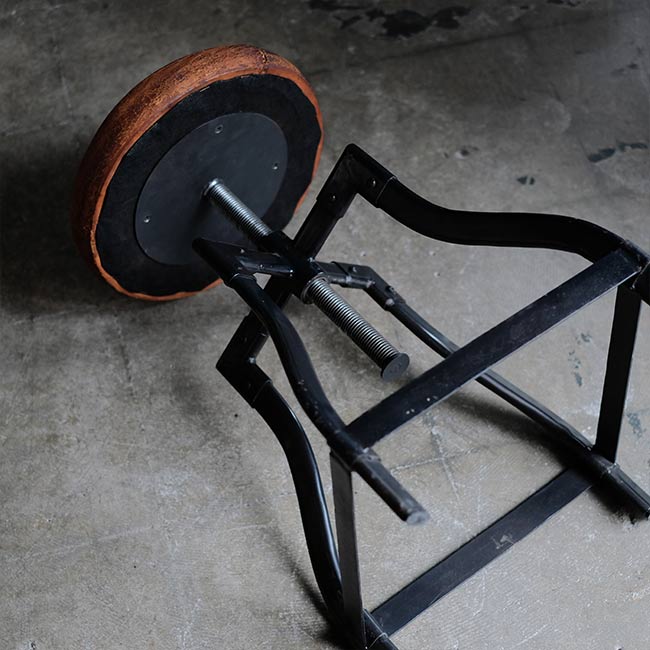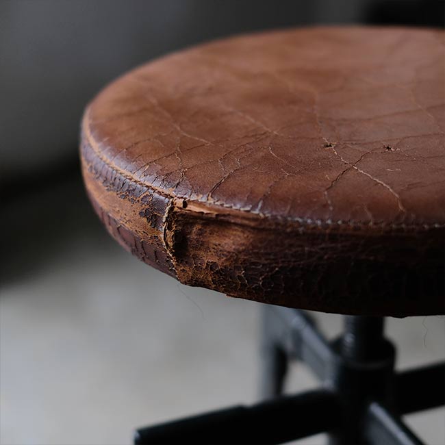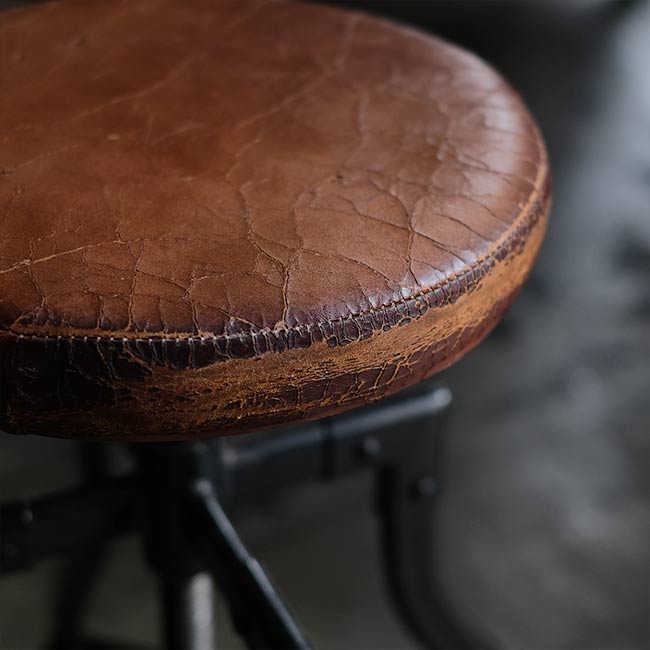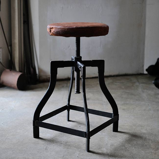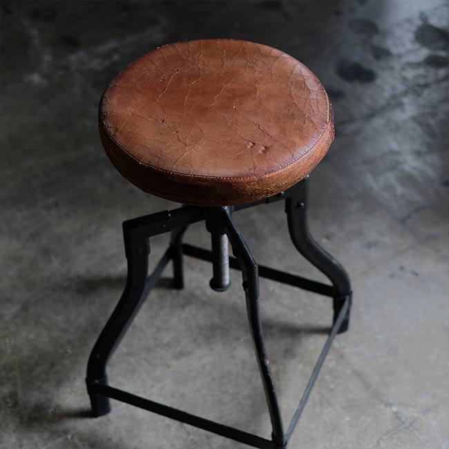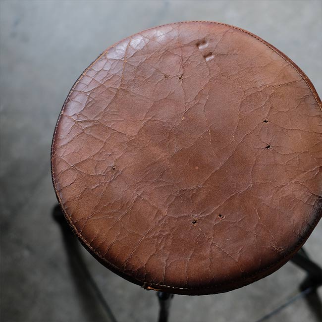 枯れたレザーの座面にアイアンレッグという組み合わせのスツールです。アメリカのものになりますが、メーカーなどの記載はなし。