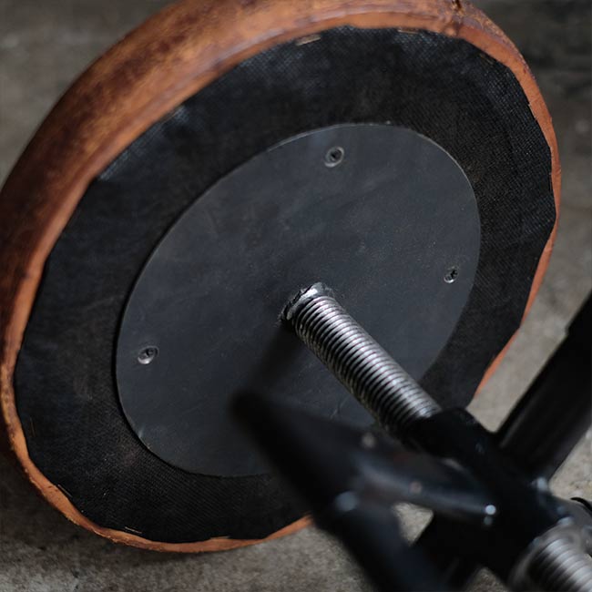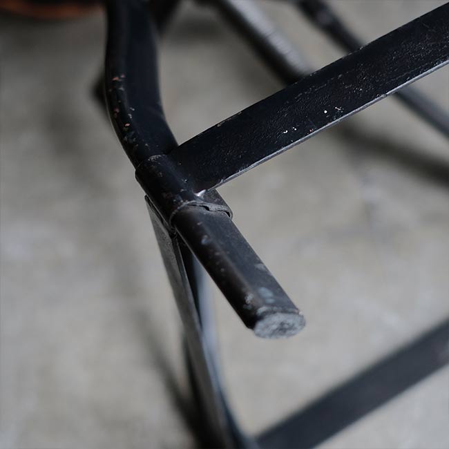 座面のレザーは固くなってひび割れていたため、オイルを2度塗り込みました。まだ少し固く、ひび割れや穴、ほつれ、凹みが見られますが、ただし見た目はかっこ良いので、やさしく座っていただけたらなと。
