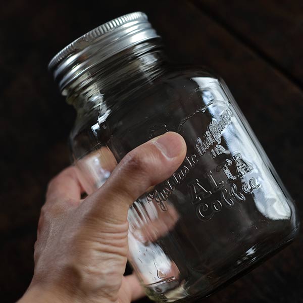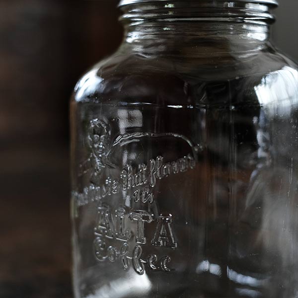Altaブランドのコーヒー豆の販売に使われていたメイソンジャー。コーヒーを飲む男性とブランドロゴが両面に入った、他にはない秀逸なデザインのボトルです。
