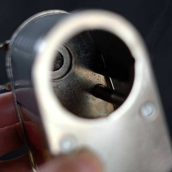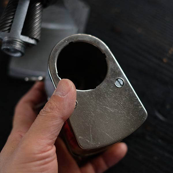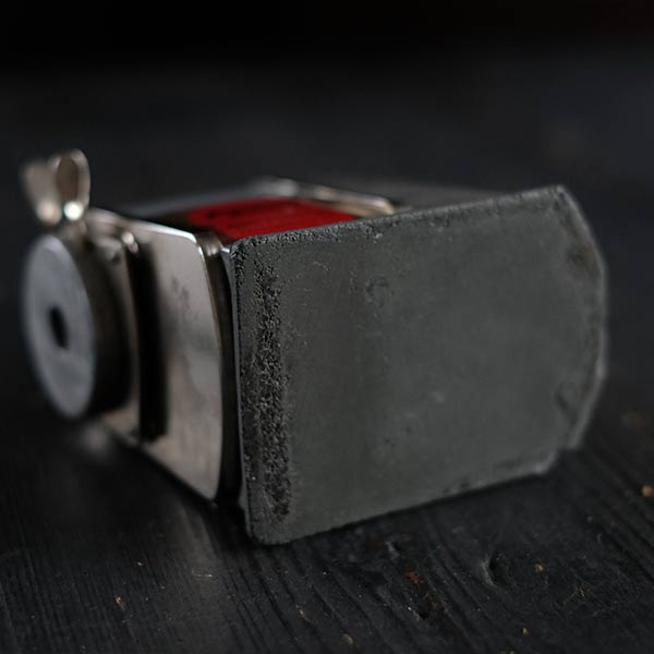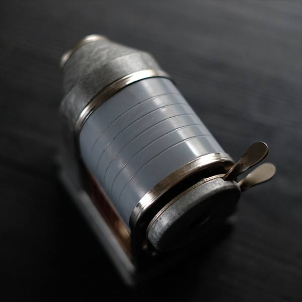 削りカスを捨てる際は、セルロイドののケース部分を向かって左に回して外します。傷等が残りますが、刃は研磨し、本体はクリーニング済み。使用に支障のあるダメージは見られません。