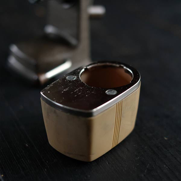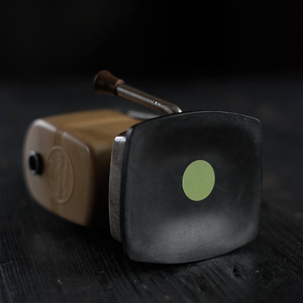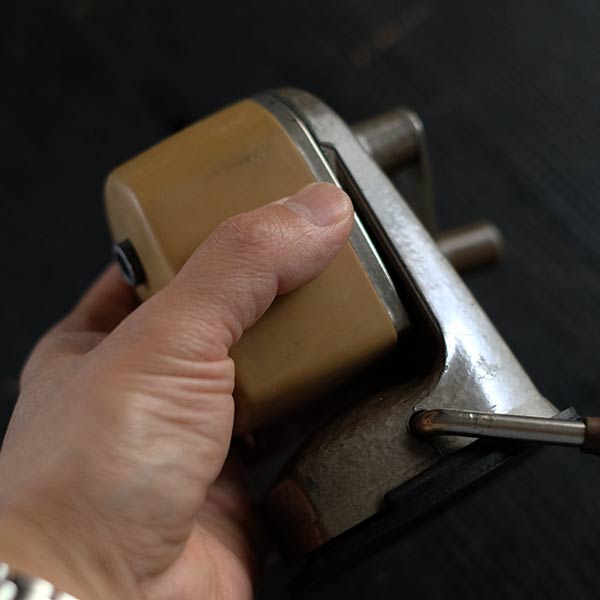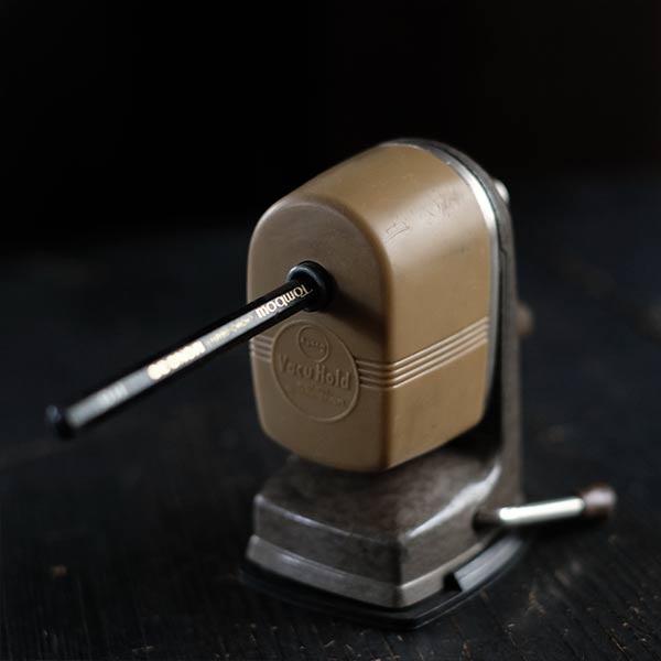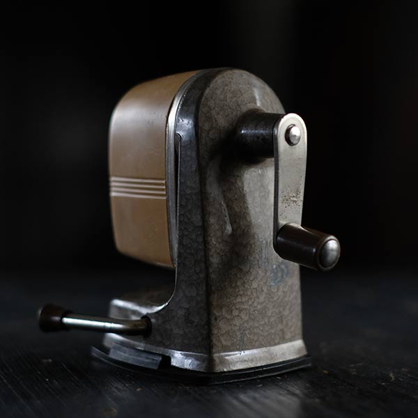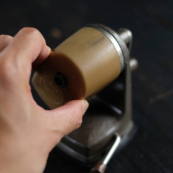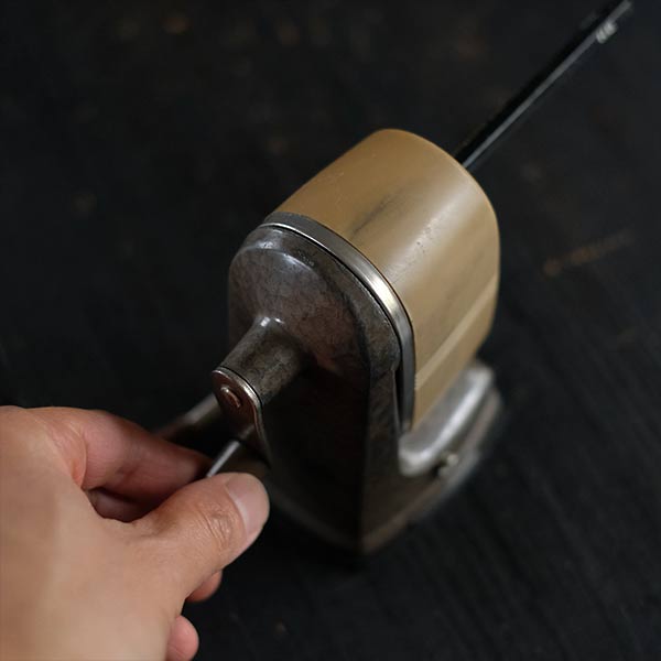 レバーを締めて本体をデスク面に吸い付かせて固定し、片手で鉛筆を持ち、もう片方の手でハンドルを回します。鉛筆を固定してくれる日本の鉛筆削りとは違いますが、かなりキレイ&シャープに削れます。削りカスを捨てる際は、ベージュ色のケース部分を向かって左に回して外します。