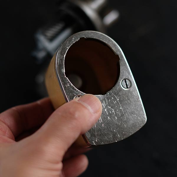傷や黒ずみ等が残りますが、刃は研磨し、本体はクリーニング済み。使用に支障のあるダメージは見られません。なお本体を吸い付かせるためにはスチール製のデスクのようなツルツルの面が必要になりますが、片手で鉛筆と鉛筆削りを固定し、もう片方の手でハンドルを回してなんとか削ることは可能です。