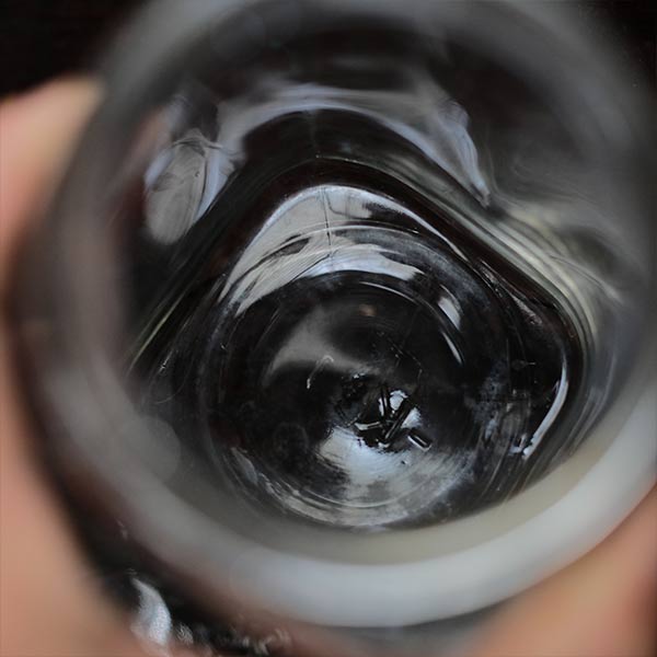 ガラスは古いだけにゆがみや縦方向にシワが見受けられます。なお使用にともなう傷は少ないですが、内側の曇りがどうしても落とせませんでした。
