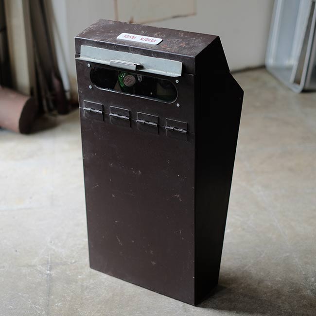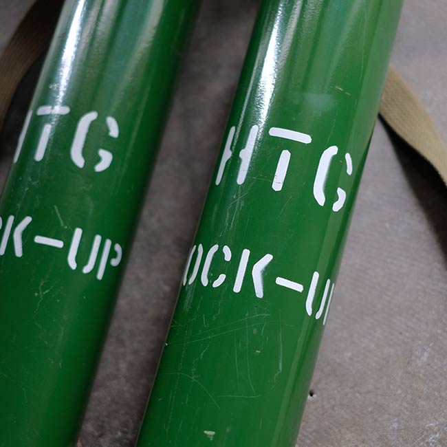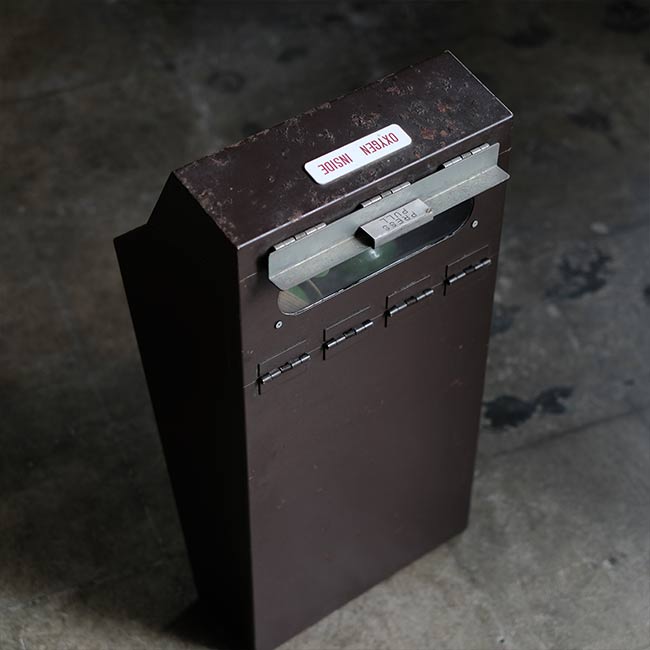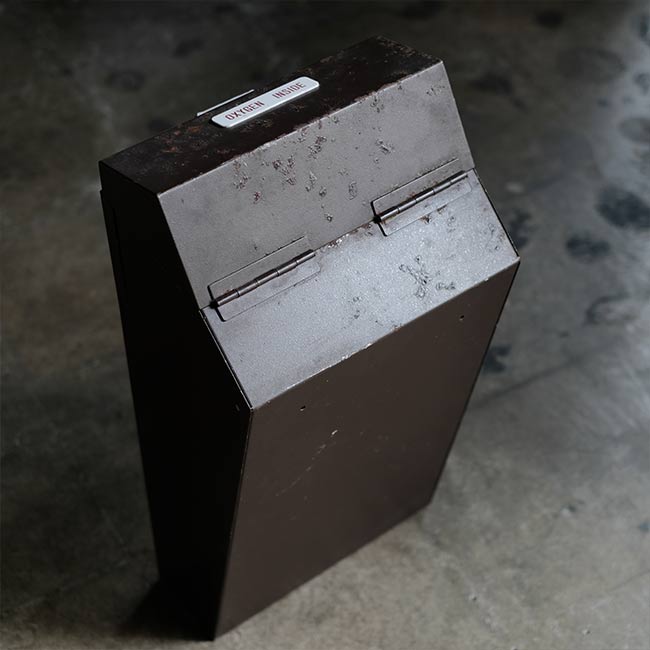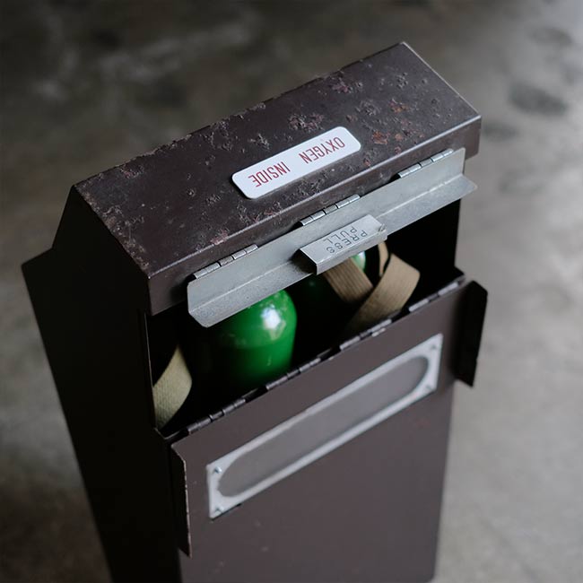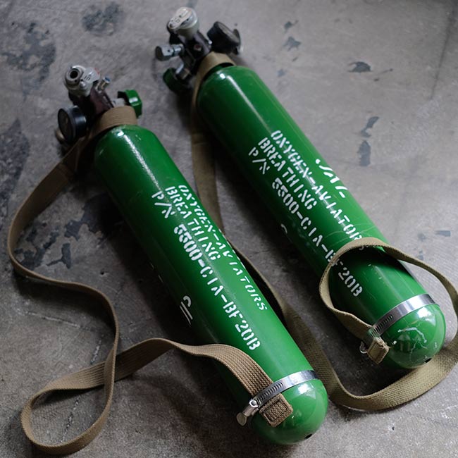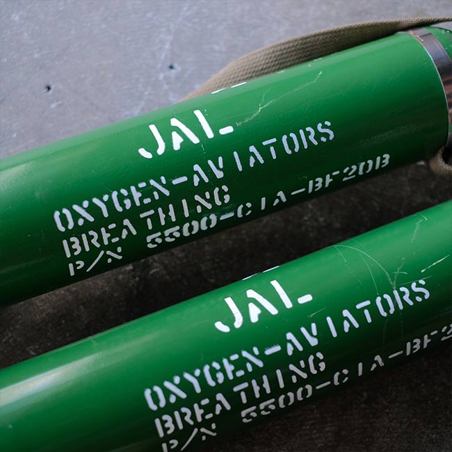 JALの機内用の酸素ボンベになります。ボンベ側面に「MOCK-UP」とあるので、メーカーが営業等で使ったものと想像します。また「AVIATORS」とありますが、操縦室用でしょうか。