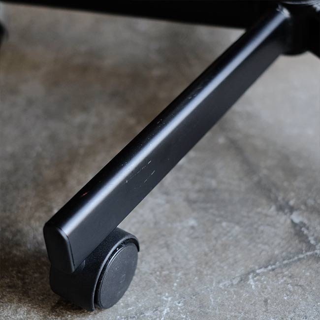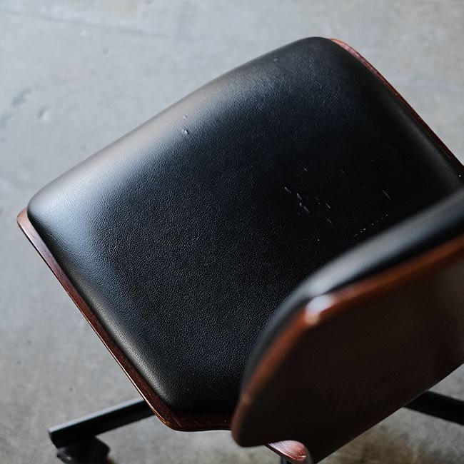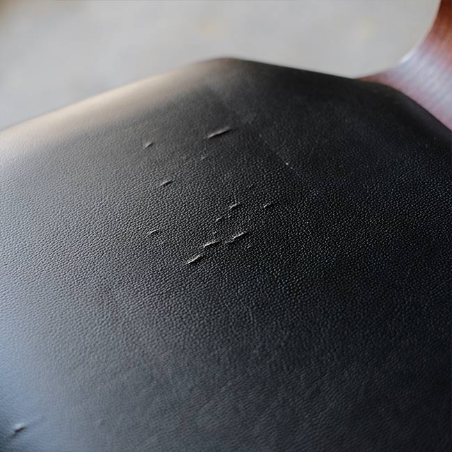 座面に傷があり、その他にも使用にともなうダメージは多少あるものの、さほど目立ちません。クッションは薄めですが、座り心地は悪くありません。高さ調節ができ、キャスターの動きも問題なし。ただしリクライニングはできませんので、ご了承下さい。
