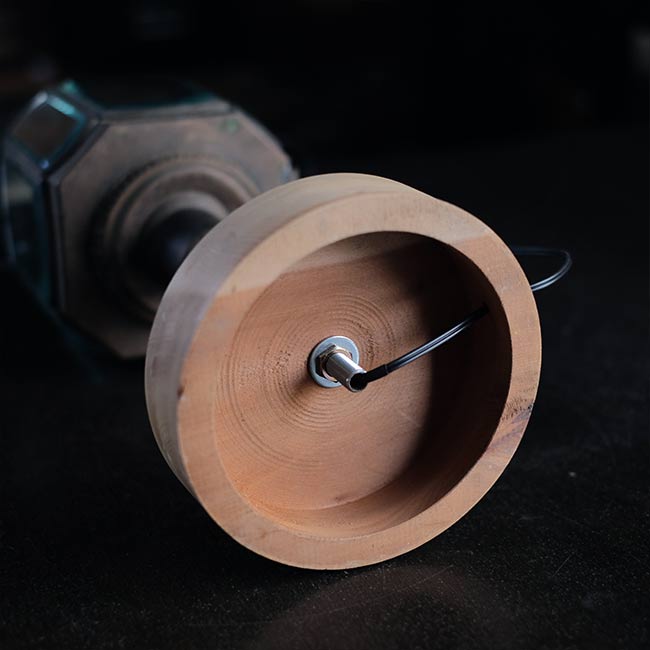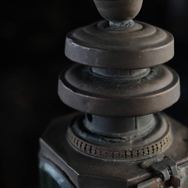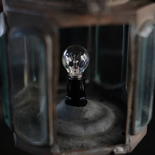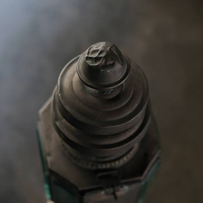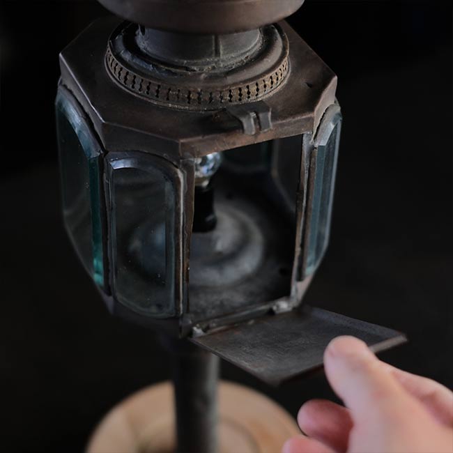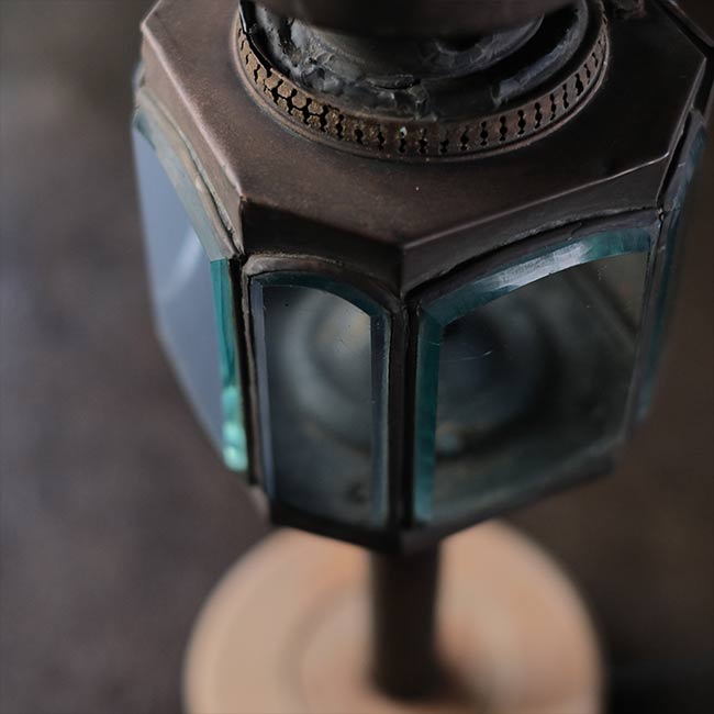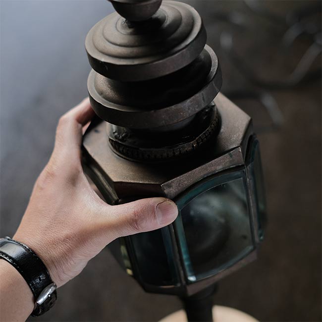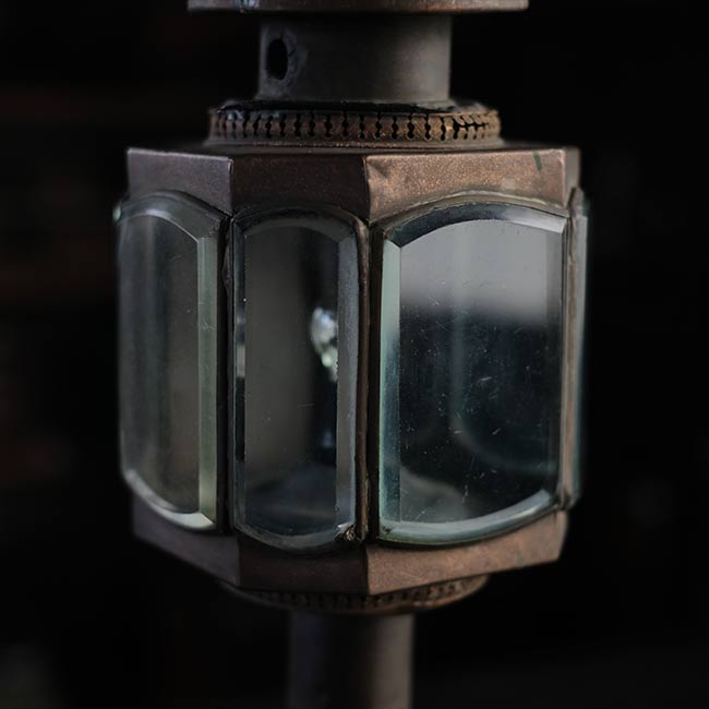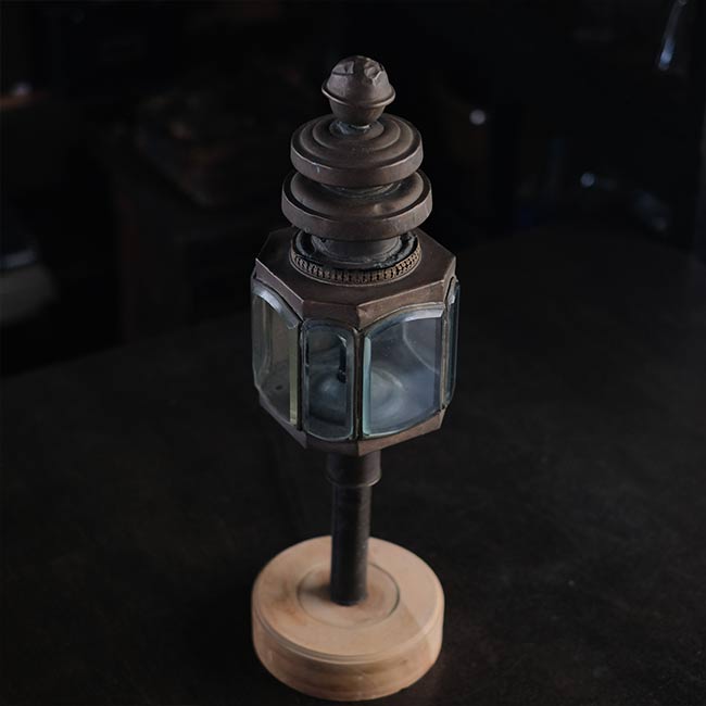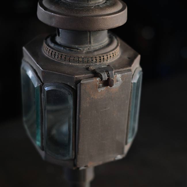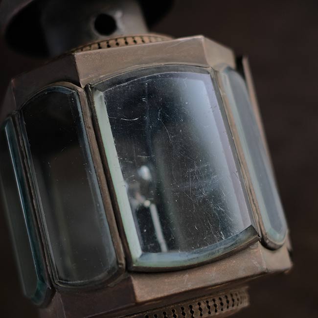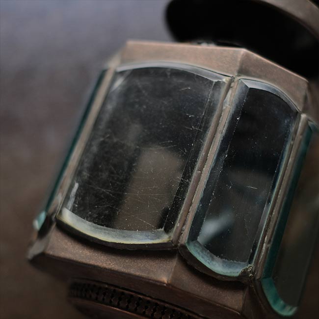 キャリッジランプと言っても色々な形状があって、ガラス窓は一方向のみに付いたものもあれば、四面、五面のものもありますが、本品は珍しく八面タイプ。一面は開閉用の扉となり、他の七面にガラスがはめ込まれています。