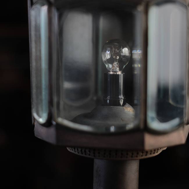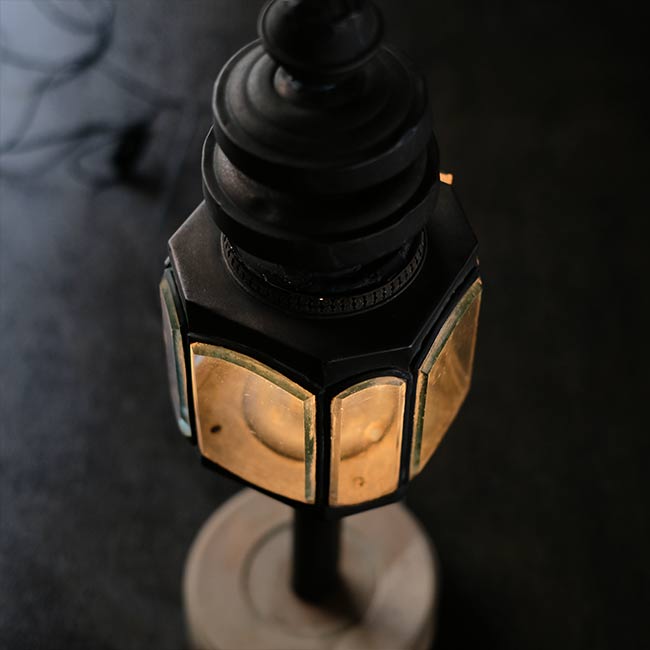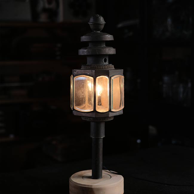 馬車や初期の自動車でも使われていたキャリッジランプが1本だけ入荷していまして、元はオイルランプなのですが、Riverside Farmさんにお願いして台座を取り付け、スタンドライトにしてもらいました。