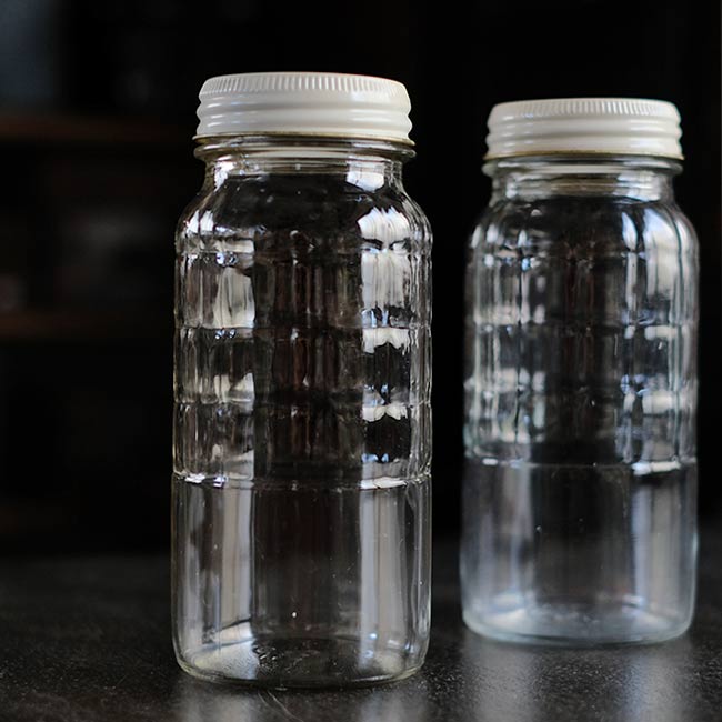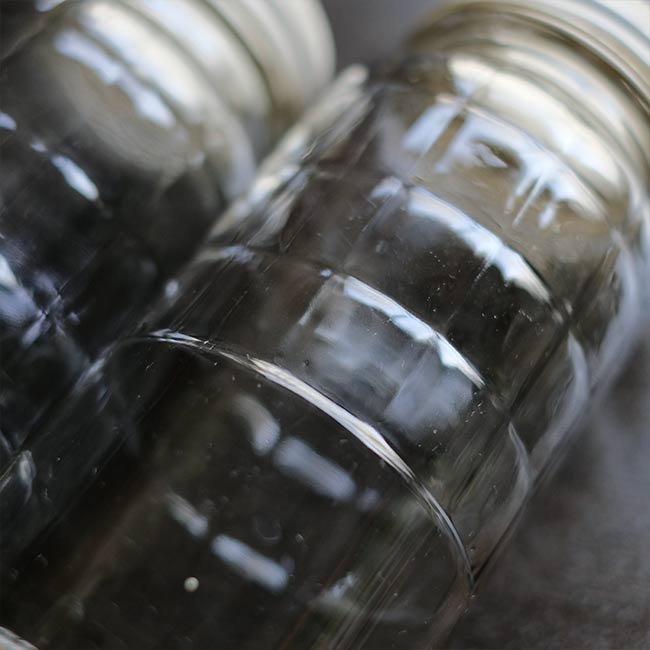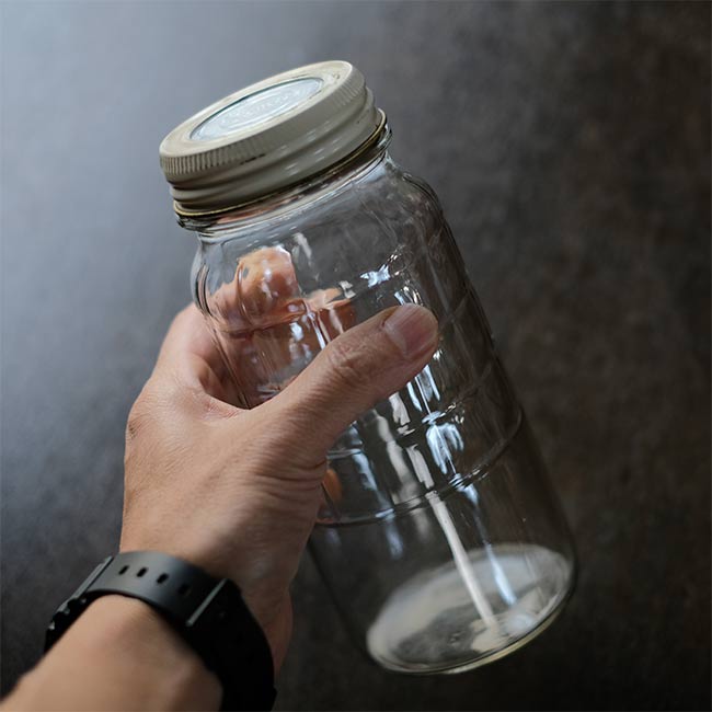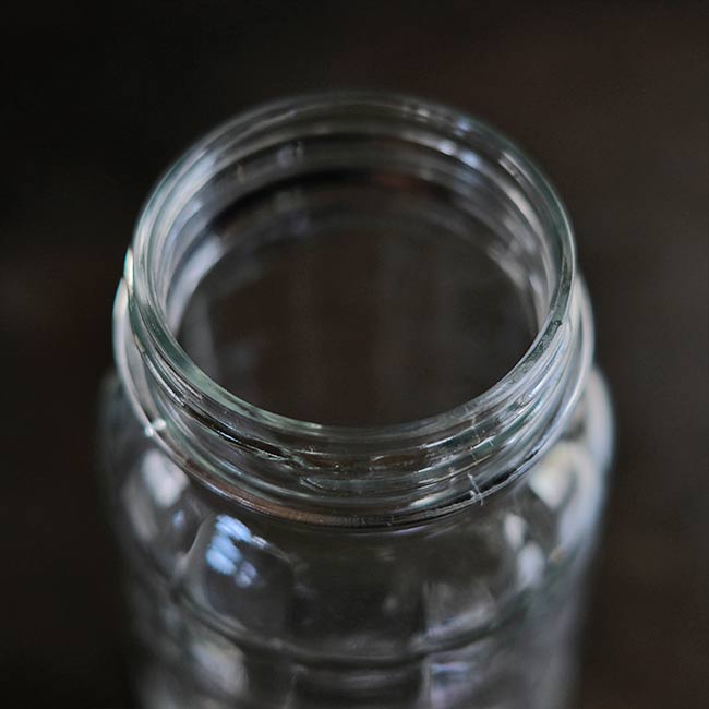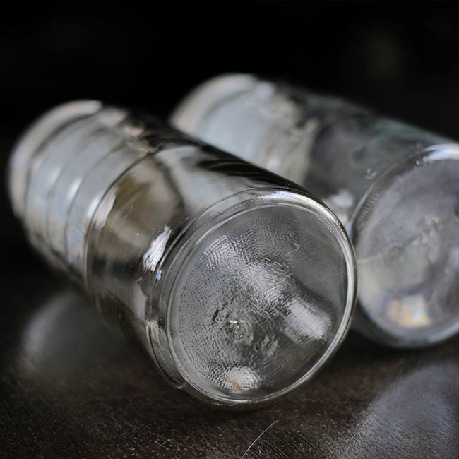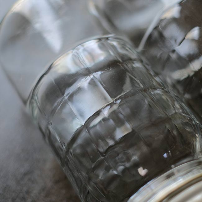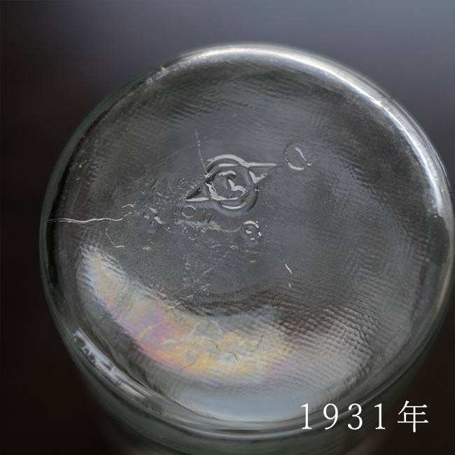 網目模様のエンボスが入った、初めて見るアメリカのメイソンジャー。製造はOwens-Illinois Glass Companyで、ピクルスやソーセージといった瓶詰め食品の販売に使われていたものではないかと想像しています。BallやKilnerといった家庭用に作られるメイソンジャーに比べると数は少ないですが、こういた類は面白いデザインのものが見つかります。