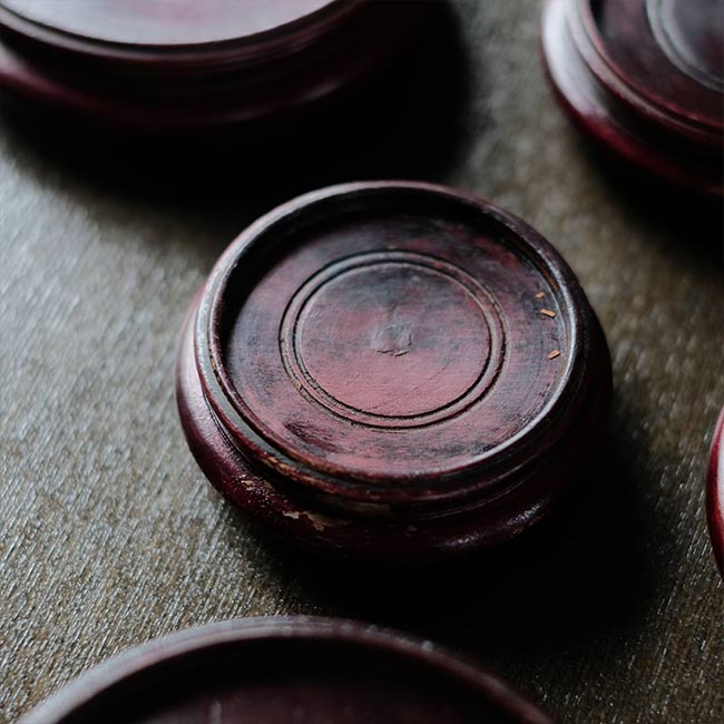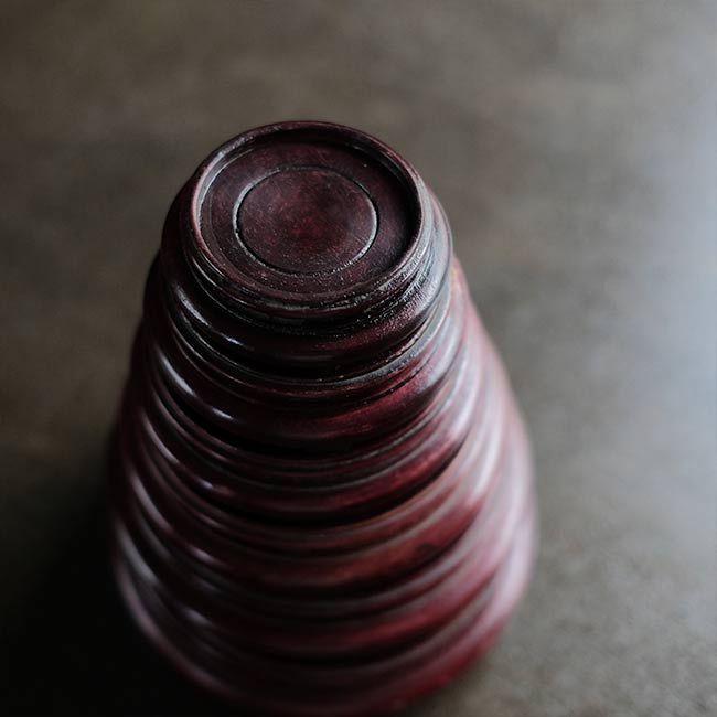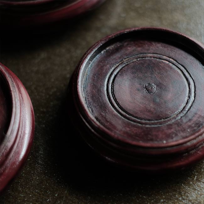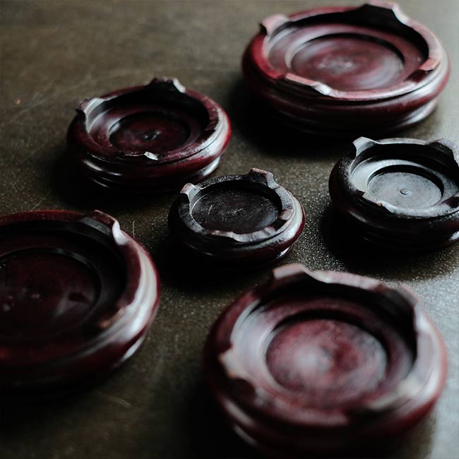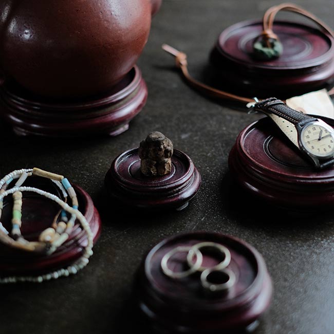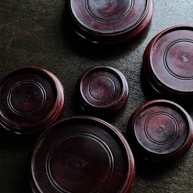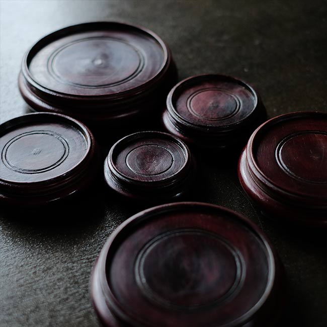 一番小さいのは直径7cm強で、リングなどのディスプレイに。一番大きいのは直径13.5cmで、ティーポットを置いたりできるサイズ感になります。サイズによって色々な使い分けができますし、重ねてディスプレイしてもよろしいかと。