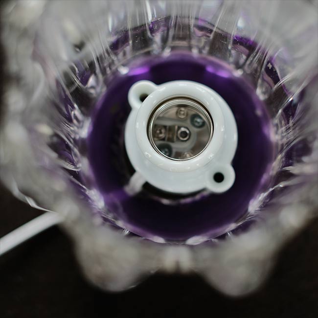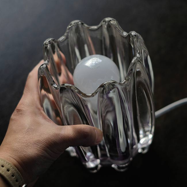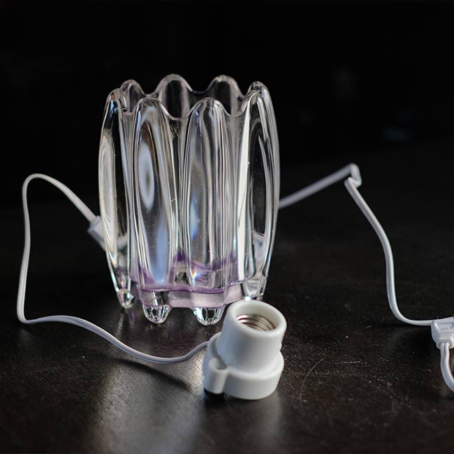 ペンダントライトのシェードだったものを置き型のランプにしました。ソケットからプラグまでは新品で、使用する電球はE26。重さは2キロほどで、安定感があります。なおソケットとコードはガラス内に固定していないため、取り外しが可能です。