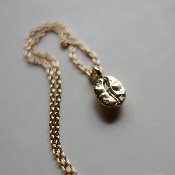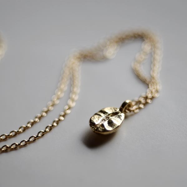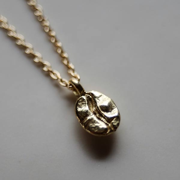 小さなコーヒー豆のペンダントトップを職人にお願いして18金で製作してもらいました。縦の長さは7.5mmと、サイズ的にはかなり小さめですが、18金のためサイズに見合わない重量感。さらにコーヒー豆の表情を忠実に再現したリアルな仕上がりとなっております。