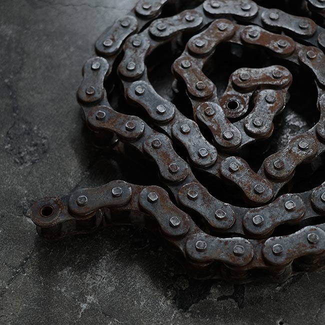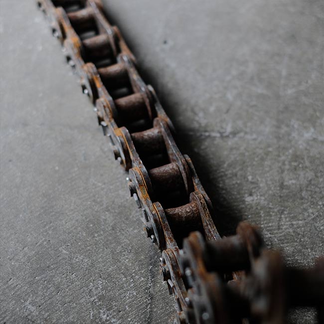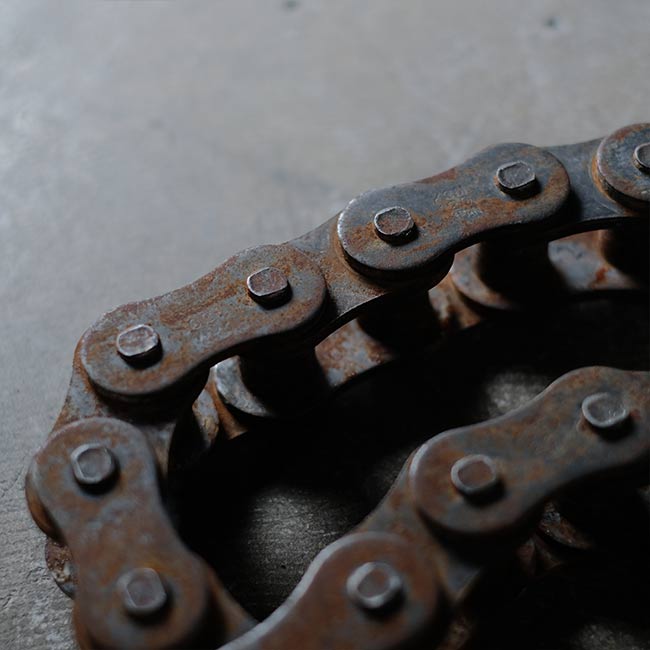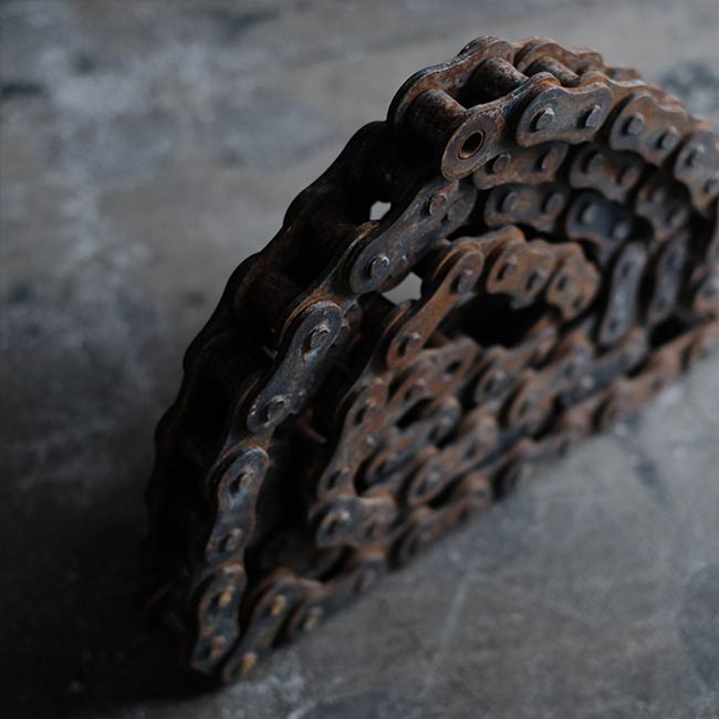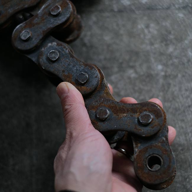 何かの動力機械に使われていたのであろう大きなローラーチェーンになります。長さは3メートル強ありまして、重量は17キロを超えます。