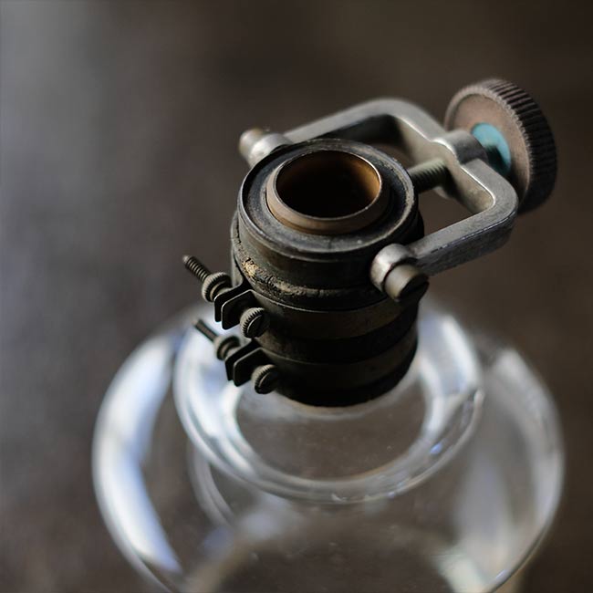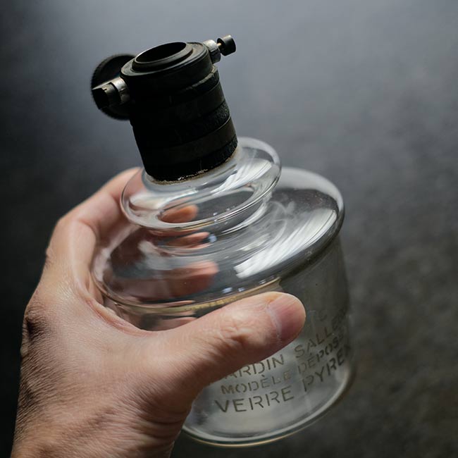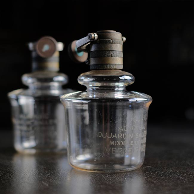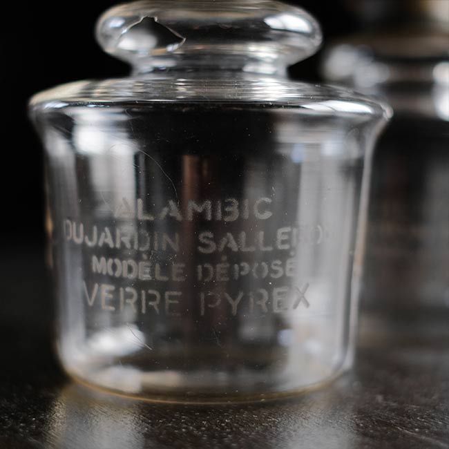 醸造所や蒸留所などの研究所向けに分析機器や測定装置を製造販売するフランスはLaboratoires Dujardin-Salleron(デュジャルダン・サレロン研究所)のガラスボトルになります。何かの機器の一部かと思われ、Pyrexガラスが使われています。