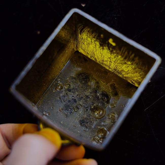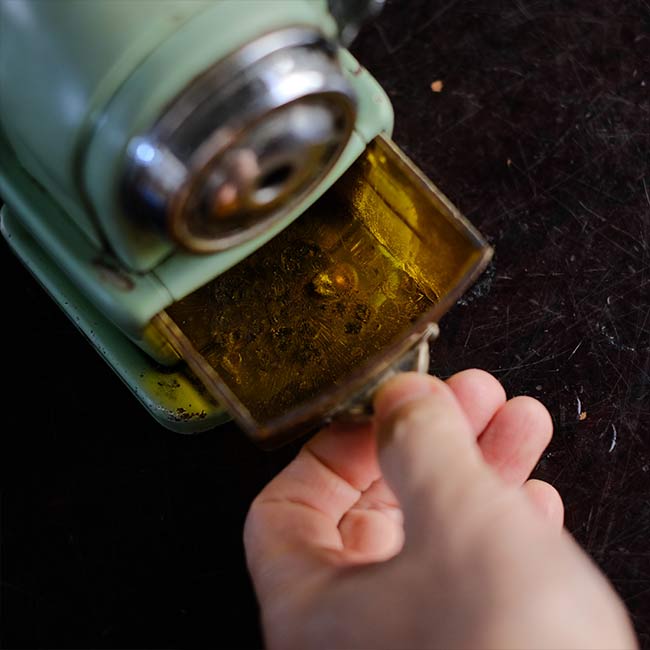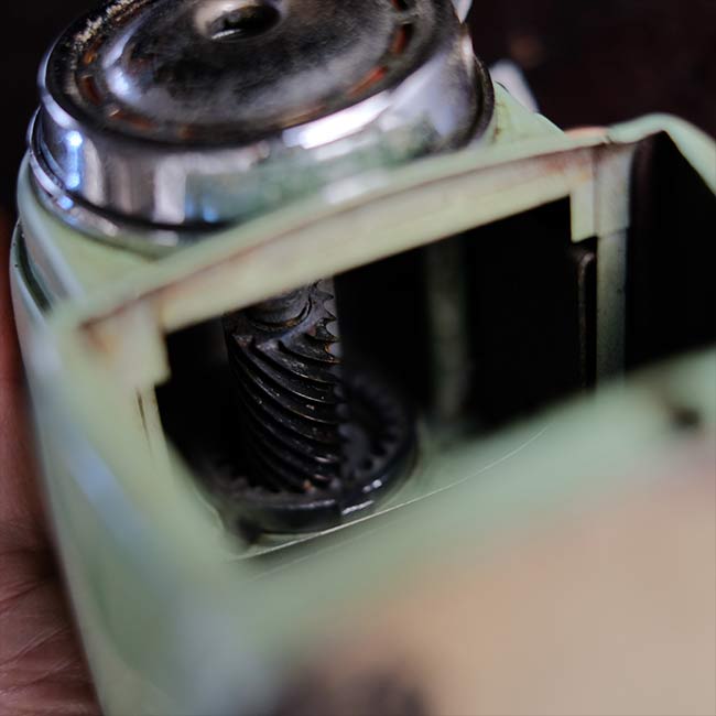 かなり黒ずみが残っていたため、入念にクリーニング。落としきれない黒ずみや傷、削りカス入れの汚れ、内部に少しサビが残りますが、入荷時からするとこれでも見違えるほどキレイになりました。