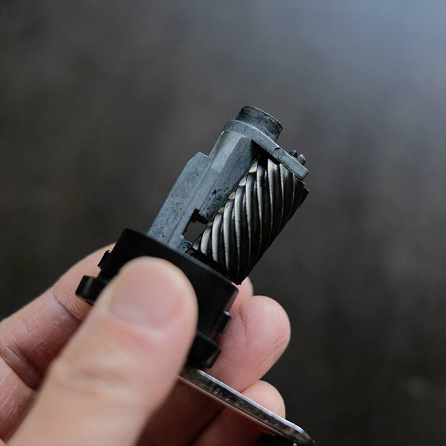 傷や黒ずみが多少残りますが、内外入念にクリーニングし、刃は研磨。ハンドルの回転もスムーズです。削った感じ、粗さはまったくなく、現代のものと比べても遜色ありません(11枚目の画像参照)。