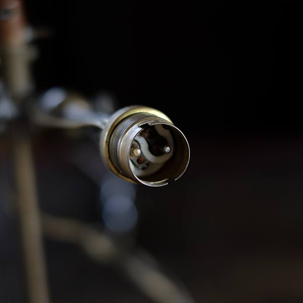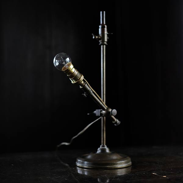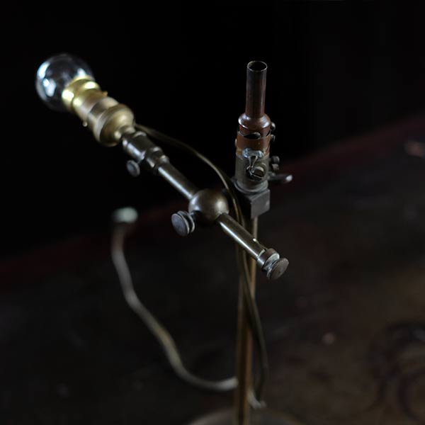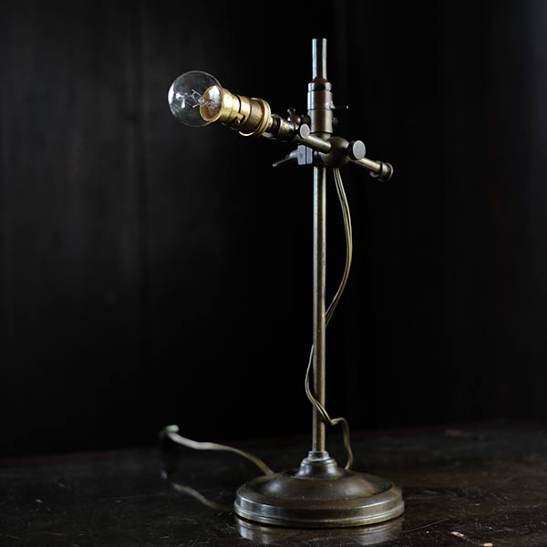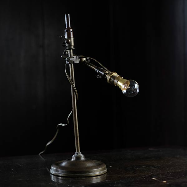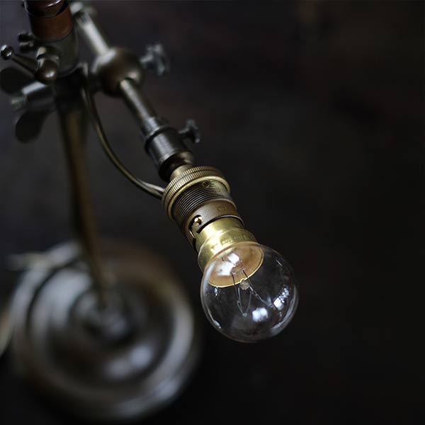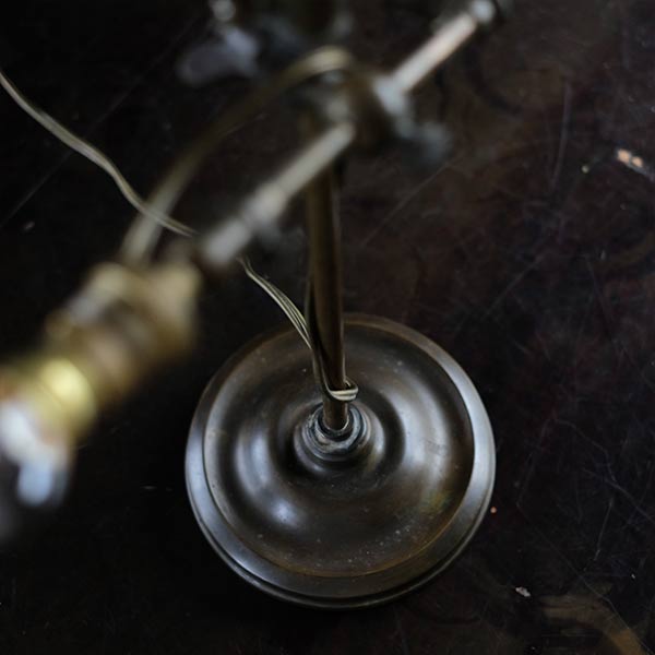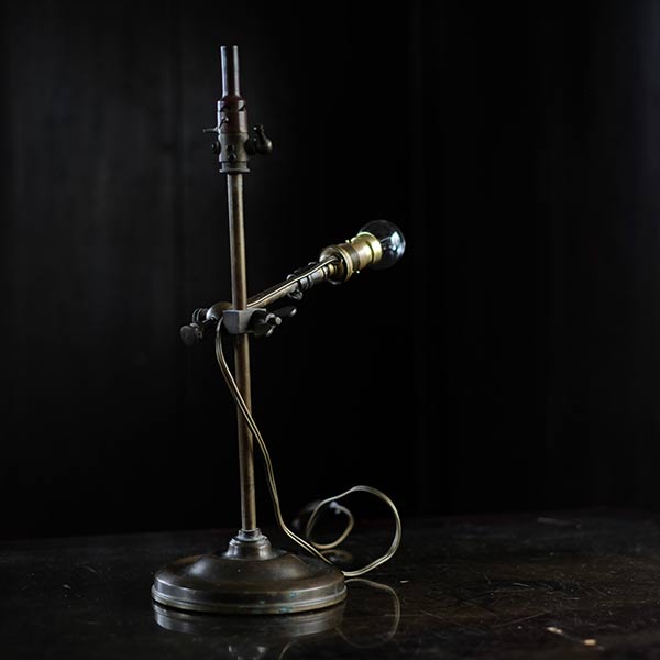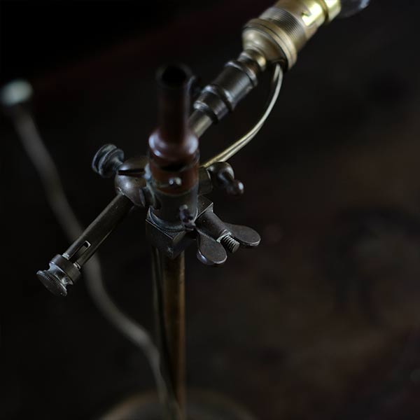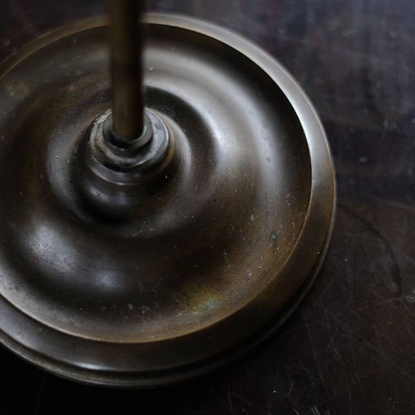 ずっしりとした重みのある真鍮製のランプ。支柱の先には小さなネジやコックが付いていて、外すと中に小さな穴があいているので、元はガスバーナーのようなものだったのでしょう。それをフランス人がリメイクしたランプになります。