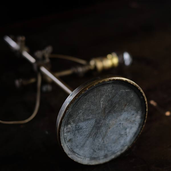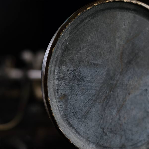 台座と支柱は真鍮ですが、支柱の先は銅かと思われます。くすみや小さな緑青も見受けられますが、錆び錆びというコンディションではなく、程よく古びた印象。