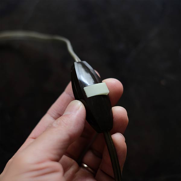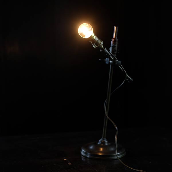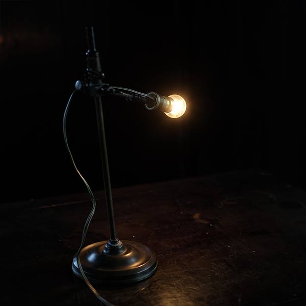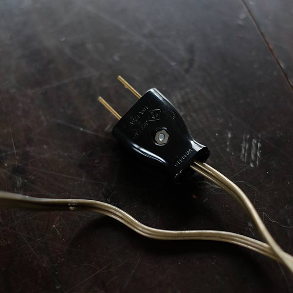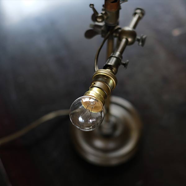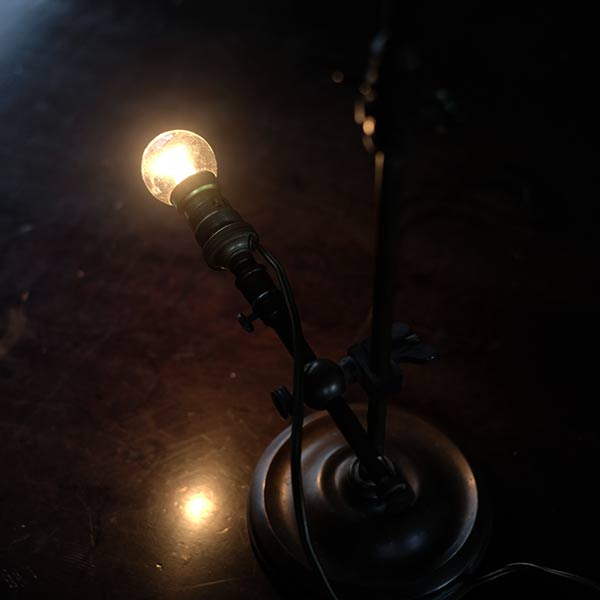 アームの高さや角度は調節が可能です。電球のサイズはE-22。コードにはON/OFFのスイッチ付き。シェードのないシンプルなランプですが、つまみやネジなどの細かいパーツが妙に魅力的です。