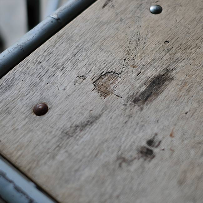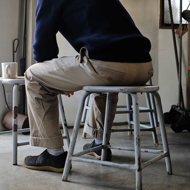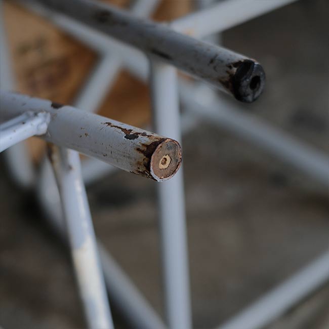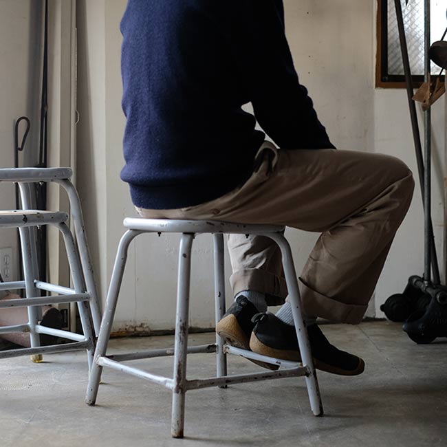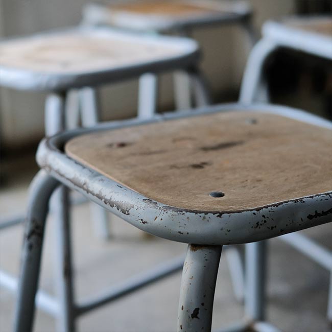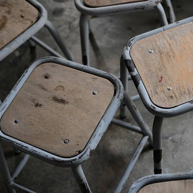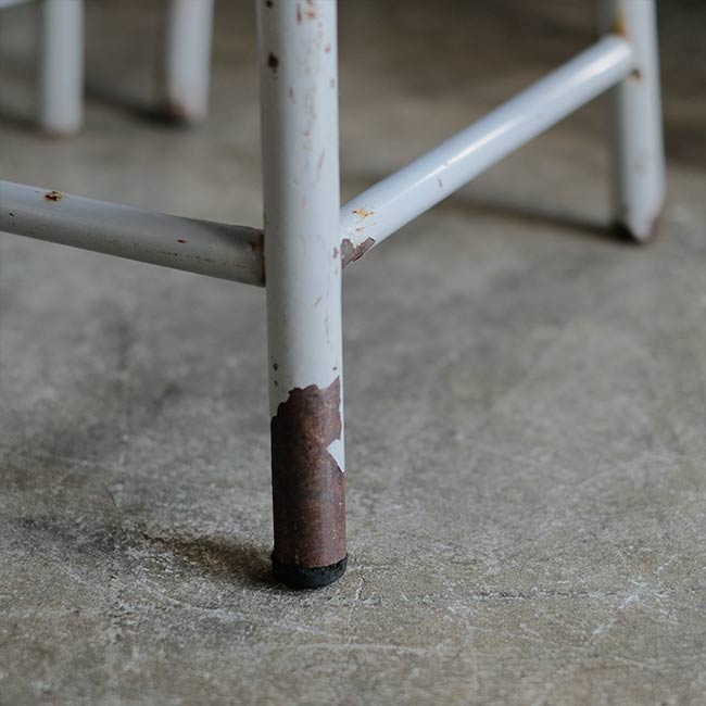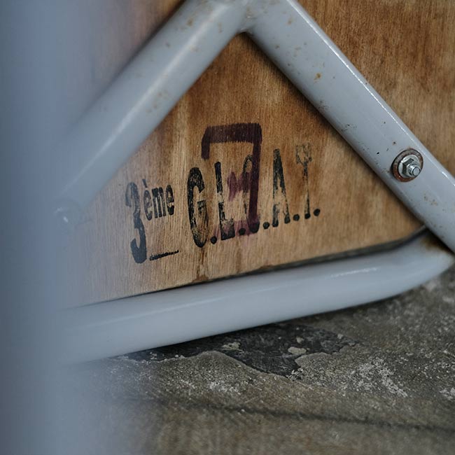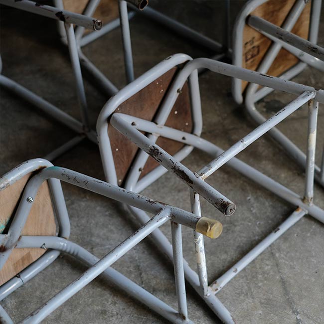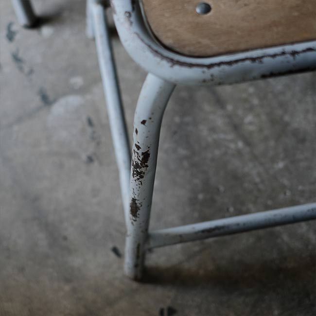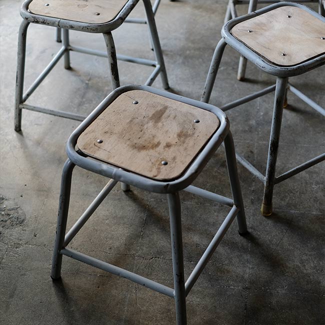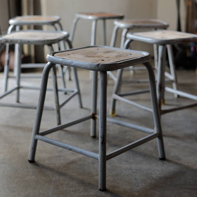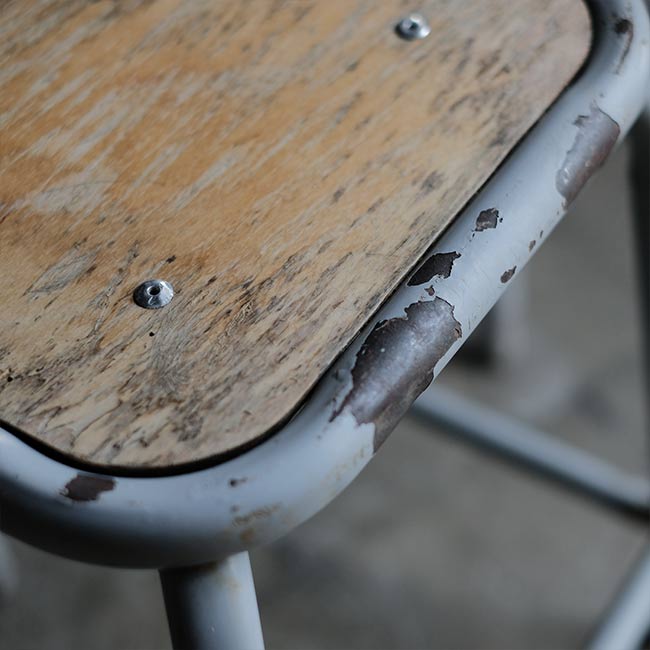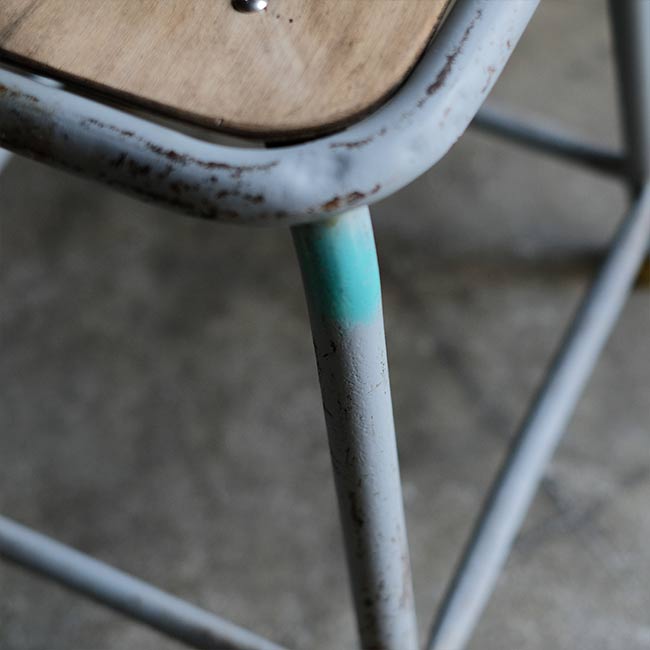 鉄脚に合板という組み合わせのフランス軍のスツールになります。パイプの径は2.5cmとやや太く、頑強な印象です。スタッキングができますので、複数あっても場所をとりません。