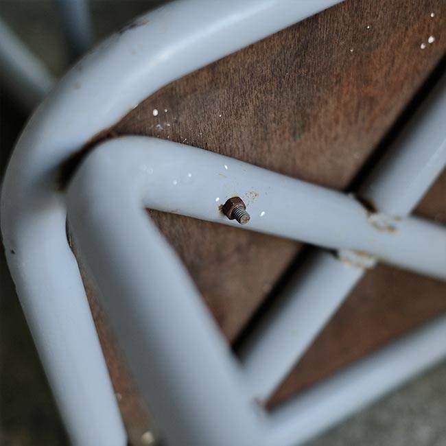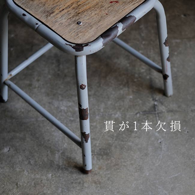 クリーニング済みですが、傷やサビ、シミ、塗装の剥がれ、凹み等がございますので、ご了承下さい。ダメージ箇所やスタンプ、脚先のキャップの有無は商品によって異なりますが、貫が1本欠損しているものと、座面に強いダメージがあるもの(材質もこれだけ異なります)は割引価格とさせていただきます。