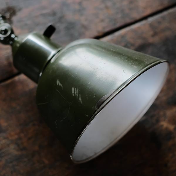 ミリタリーな印象のオリーブドラブのシザーランプです。壁に固定するのではなく、ポールから伸び縮みさせる仕組み。ポールはクランプで台に固定させます。