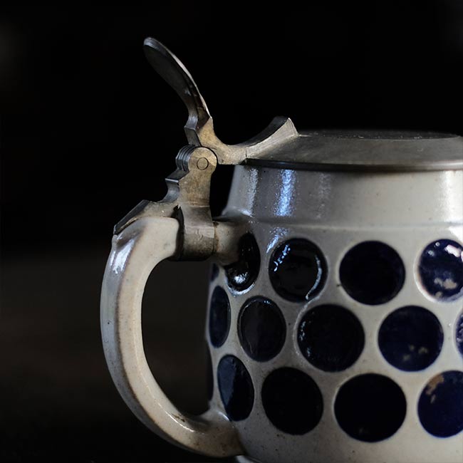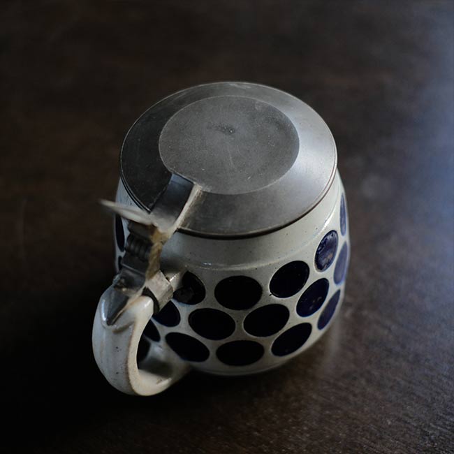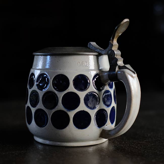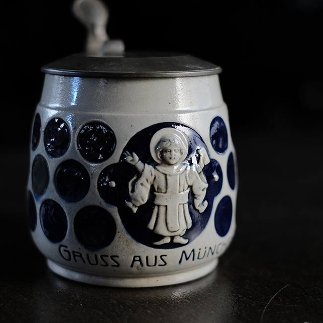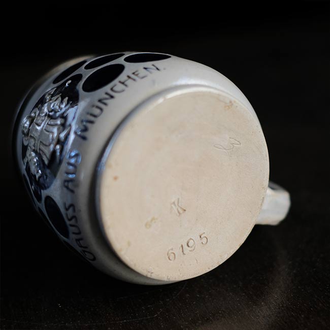 青みがかったグレーが特徴的な塩釉のビアマグになります。ドイツのもので、「GRUSS AUS MUNCHEN」と入っていますが、底の刻印の意味はわかりませんでした。