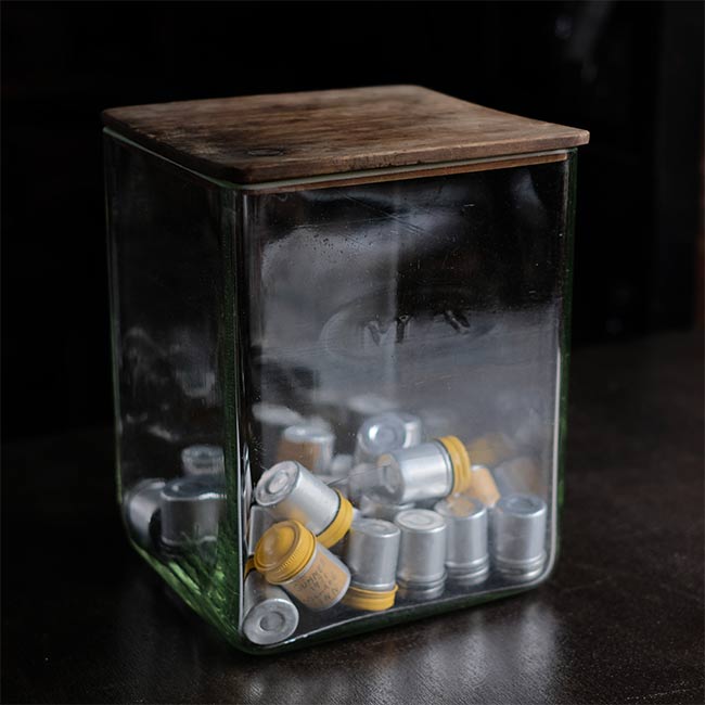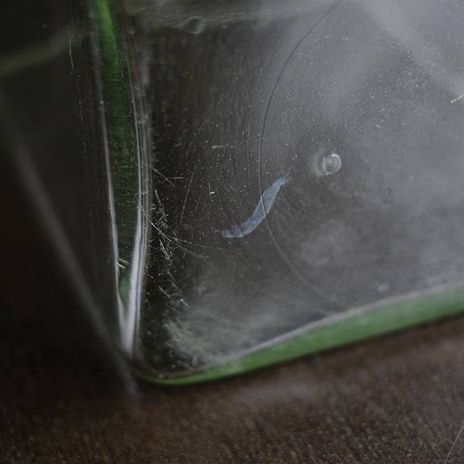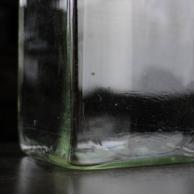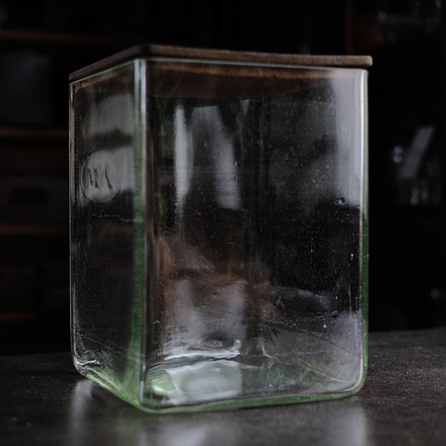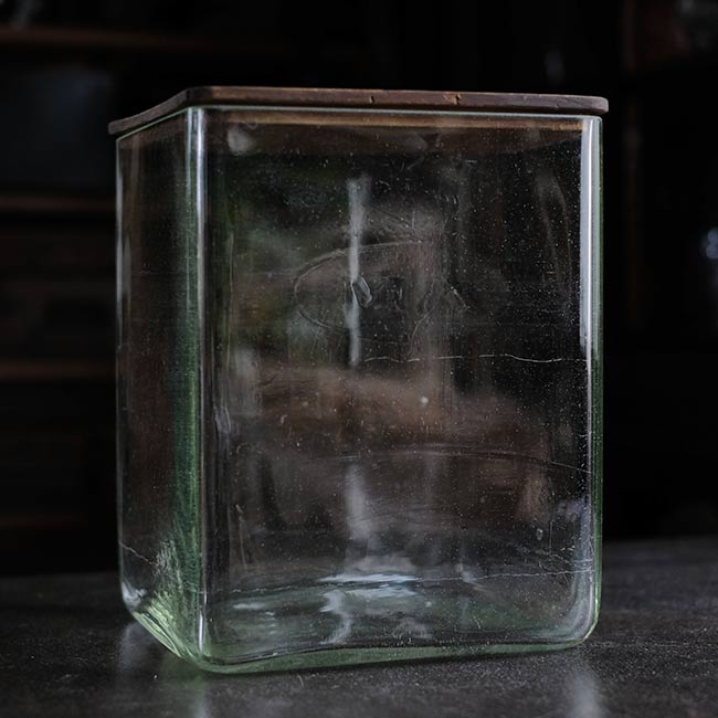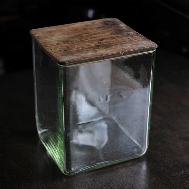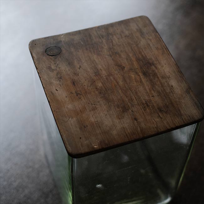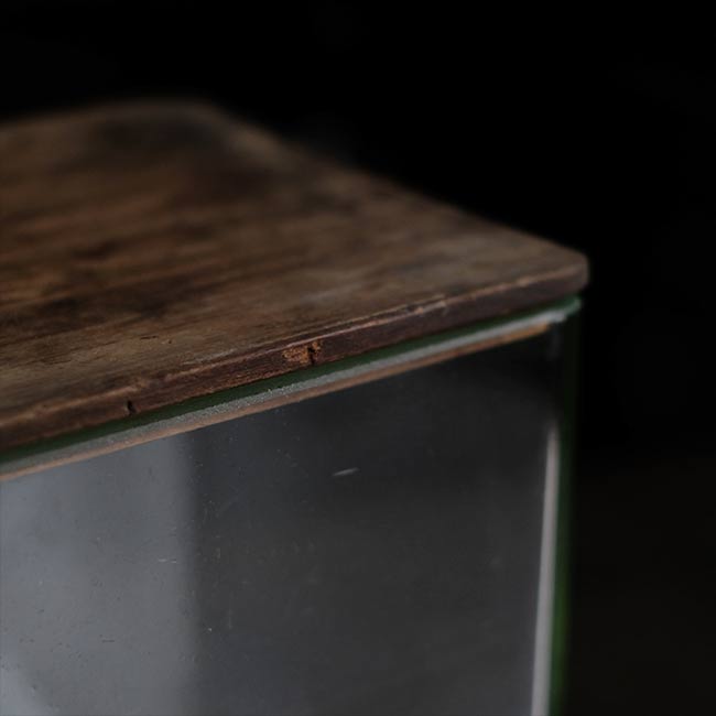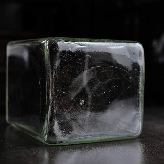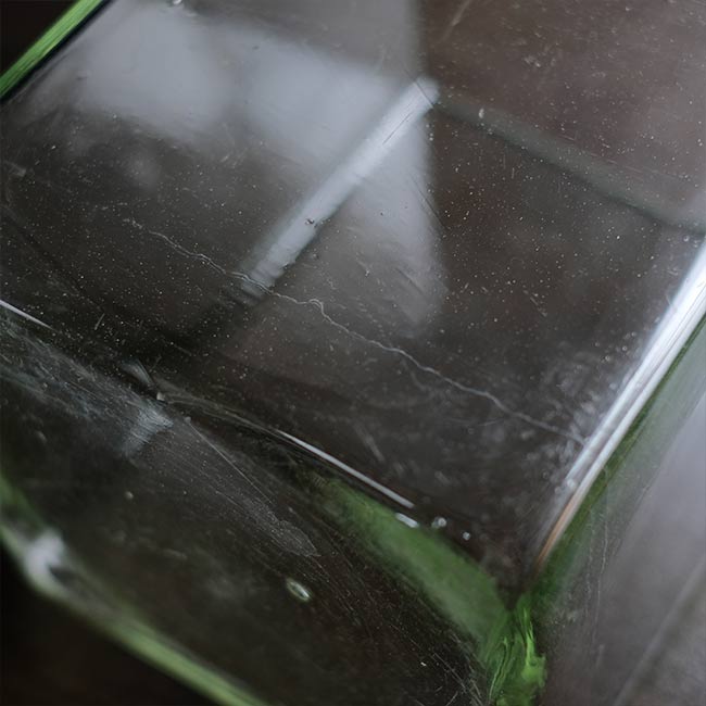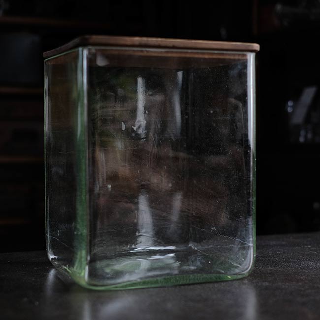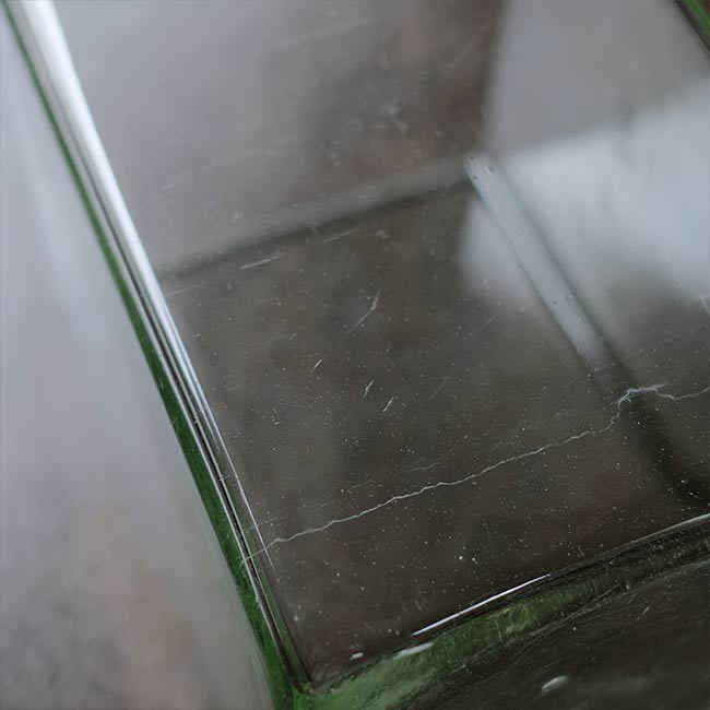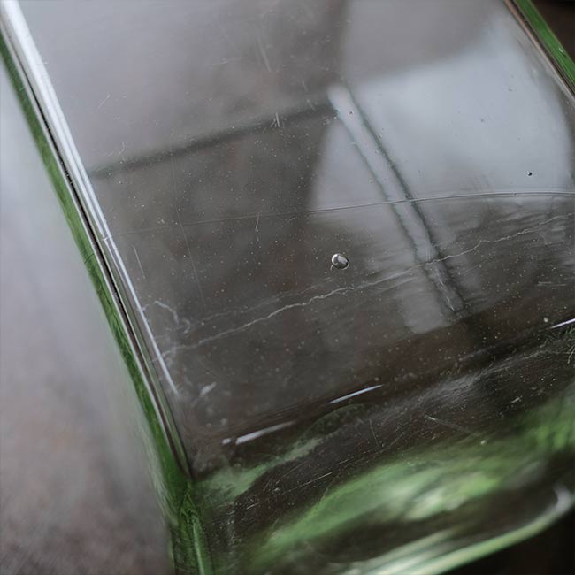 ガラスは気泡やシワの見られる古手のもので、緑がかった色味をしています。小キズや落とせない汚れ、曇りが残るのと、縁に一箇所欠けがあります。また蓋はソリがありますので、何卒ご了承下さい。