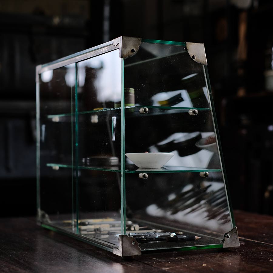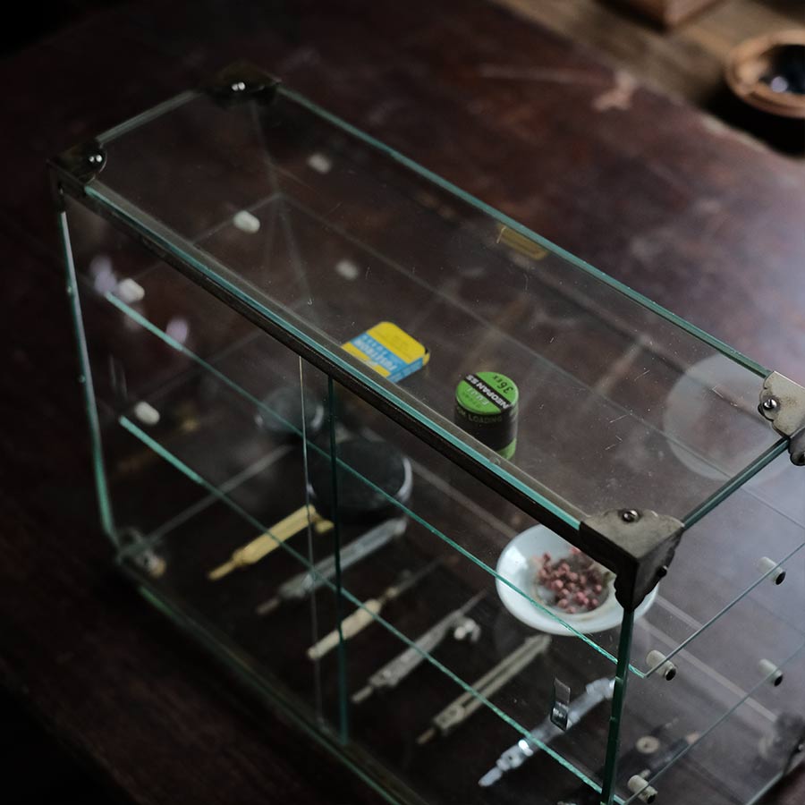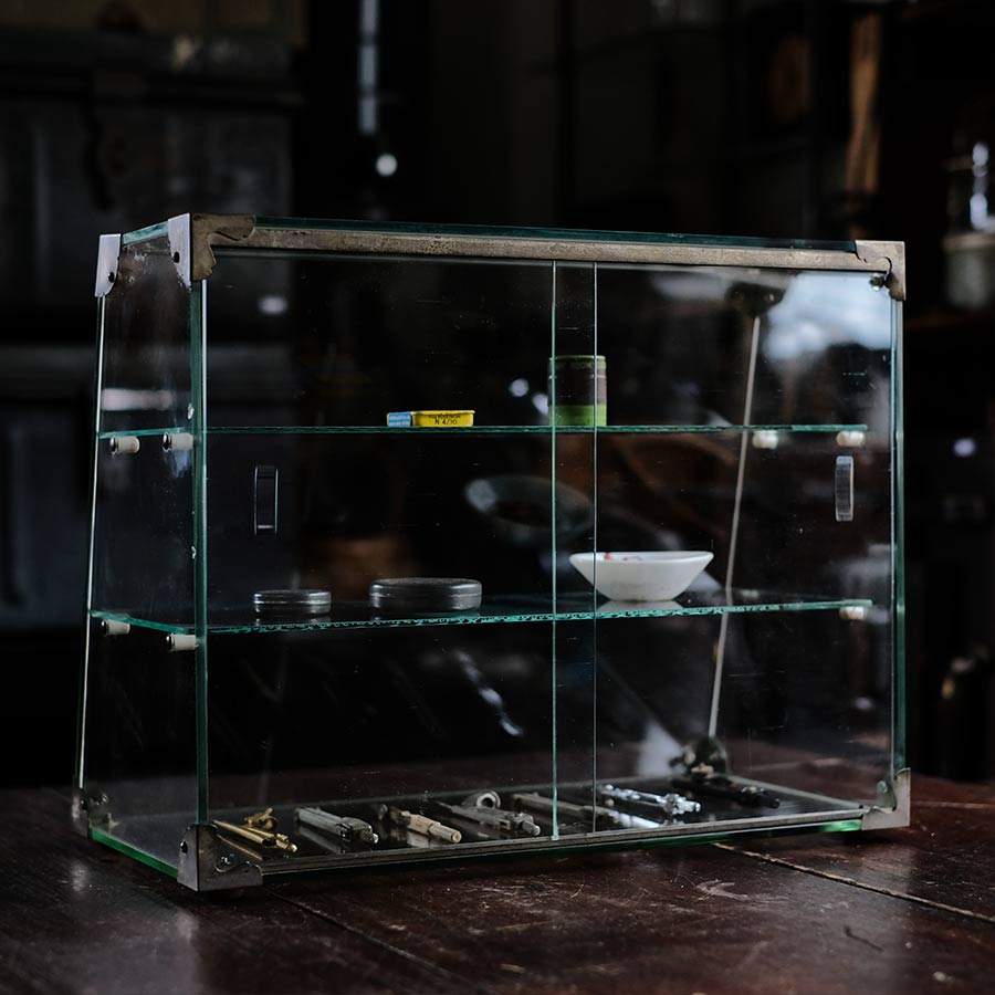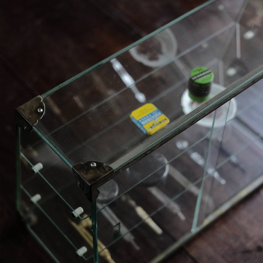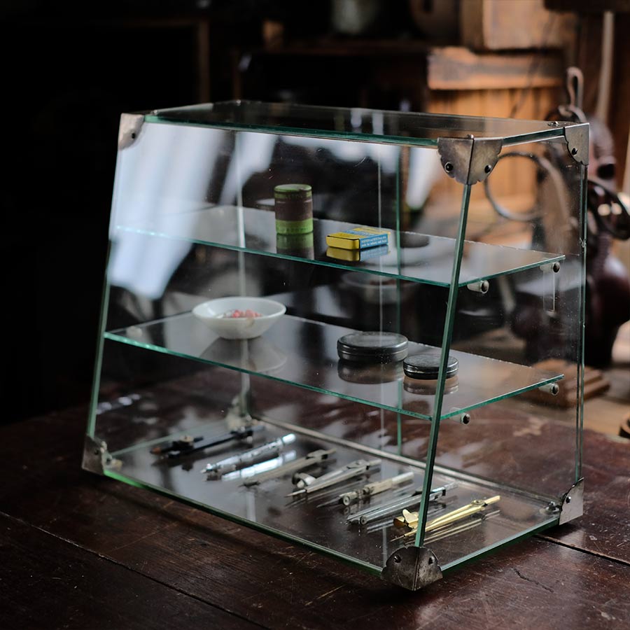商店で使われていた小ぶりなガラスのディスプレイケース。扉と反対側は傾斜をつけてあり、奥行は上段12.7cm、中段15cm、下段が18cm程度となっております。