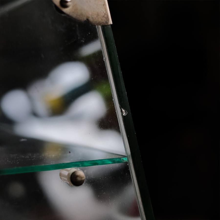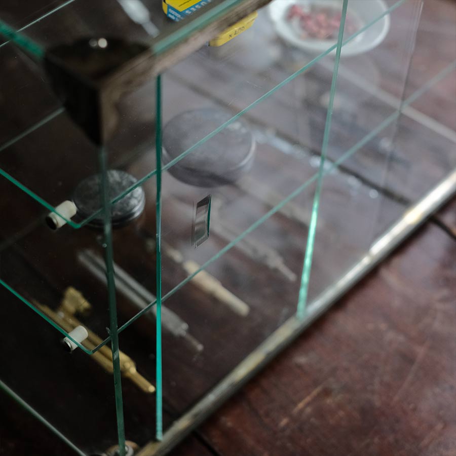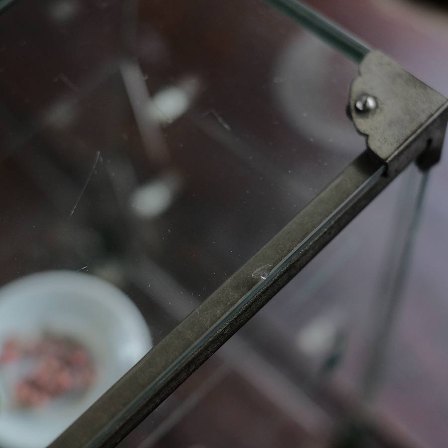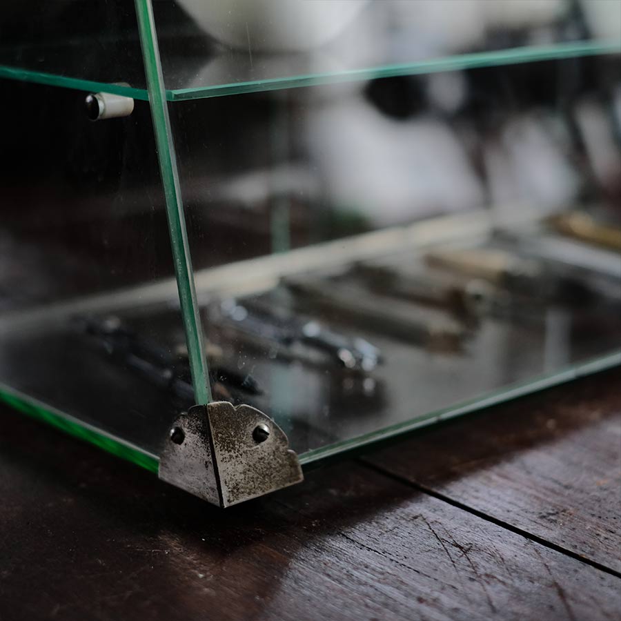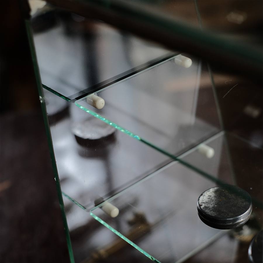 商店で使われていた小ぶりなガラスのディスプレイケース。扉と反対側は傾斜をつけてあり、奥行は上段12.7cm、中段15cm、下段が18cm程度となっております。