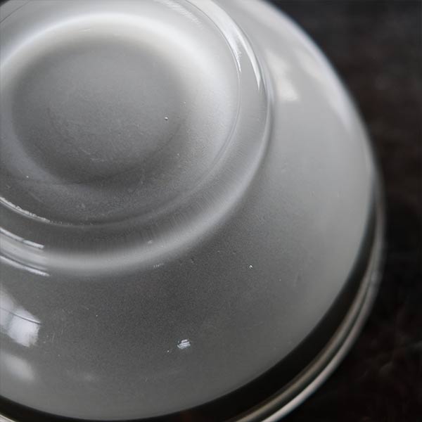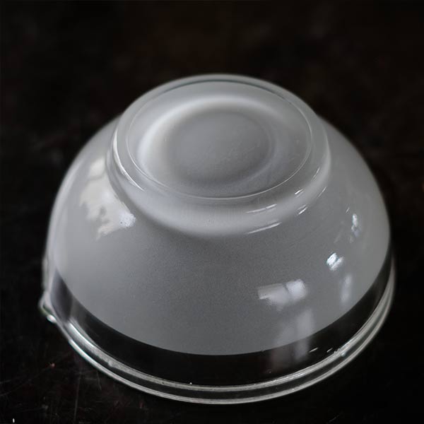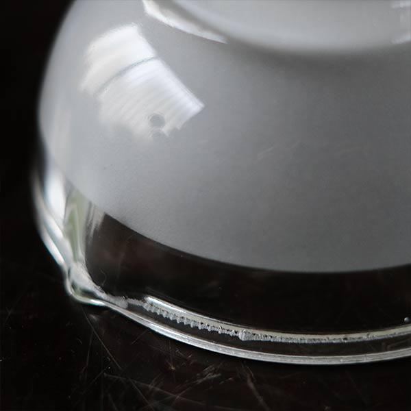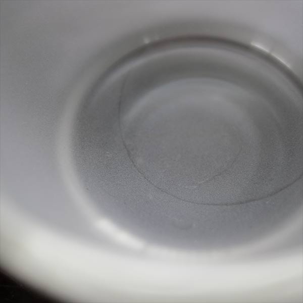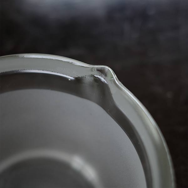 サラダボウルにも使えそうなサイズ感で、注ぎ口付き。フチの内外のバリを削ったあとがあるのと、すりガラスの部分に傷が見られますが、全体的に強い使用感は感じられません。