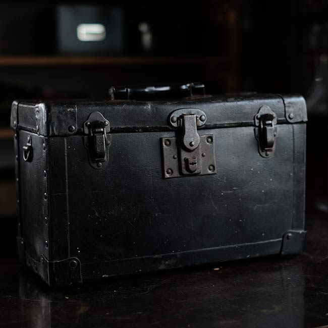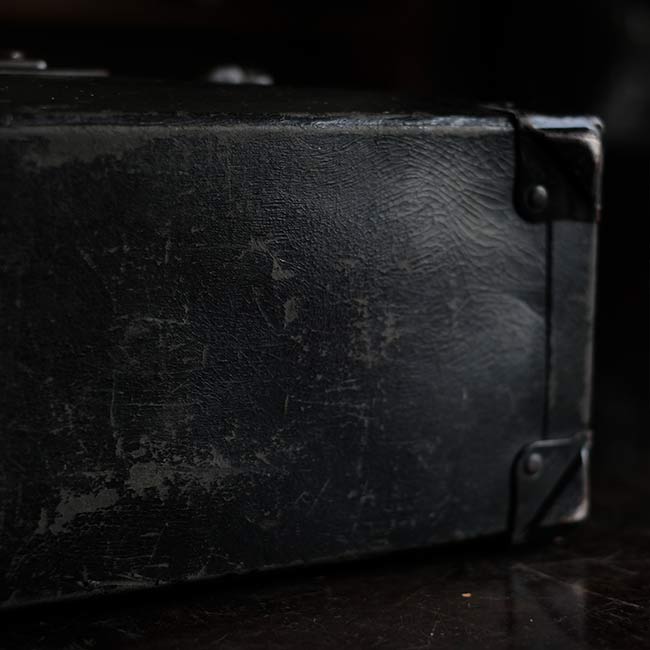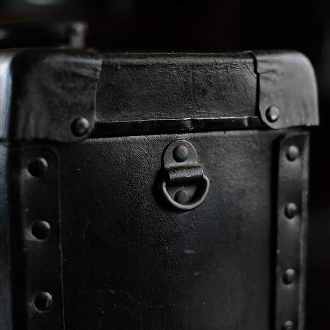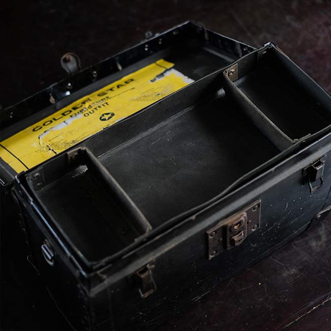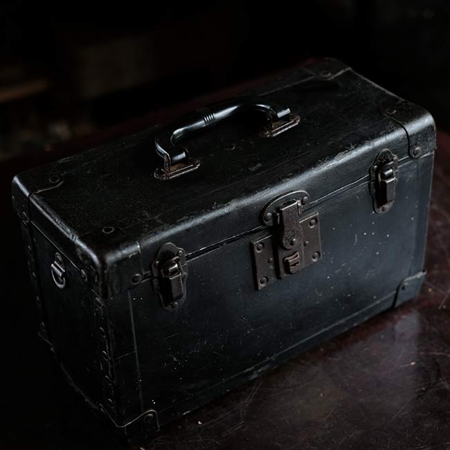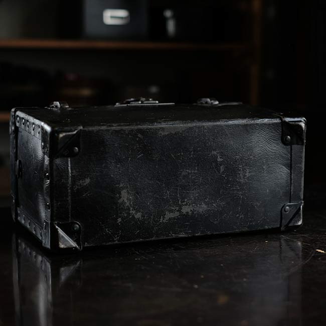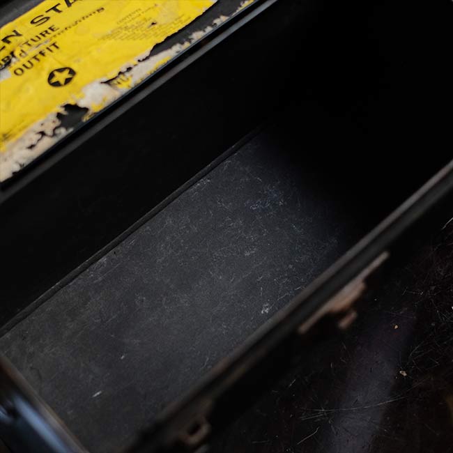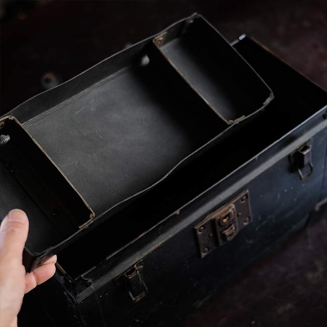 落としきれない汚れやくすみ等が残り、そこそこやれた雰囲気ではありますが、留め具はサビをある程度落とし、外側は全体を極少量の蜜蝋ワックスで磨きました。工具や文具、その他身の回りの様々な小物の収納に。