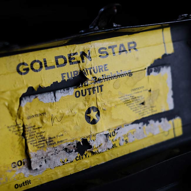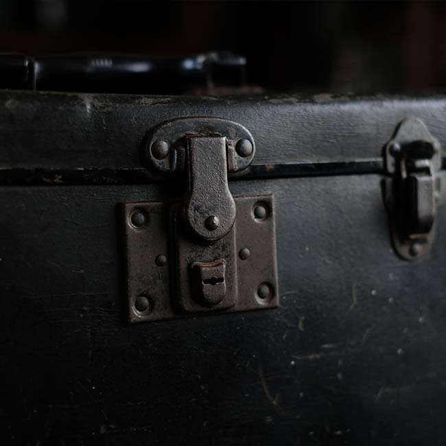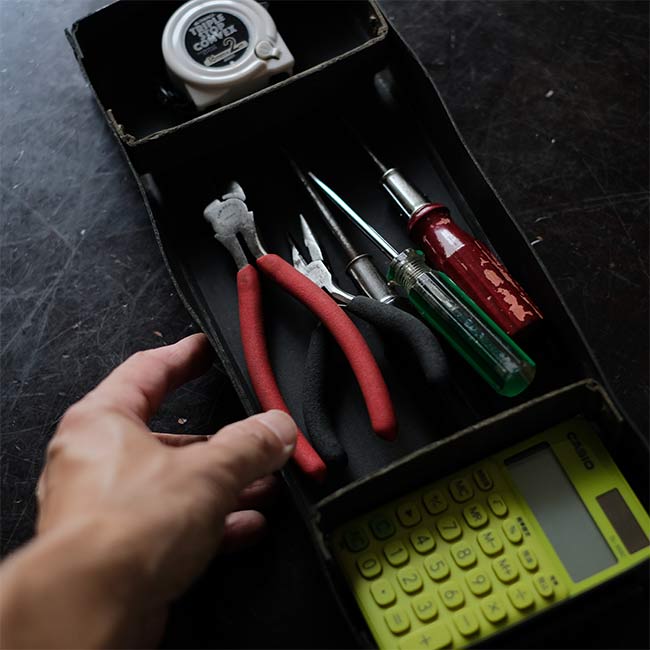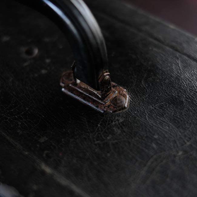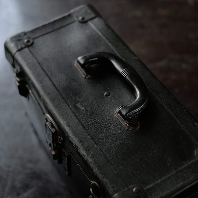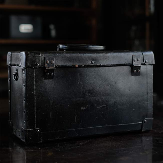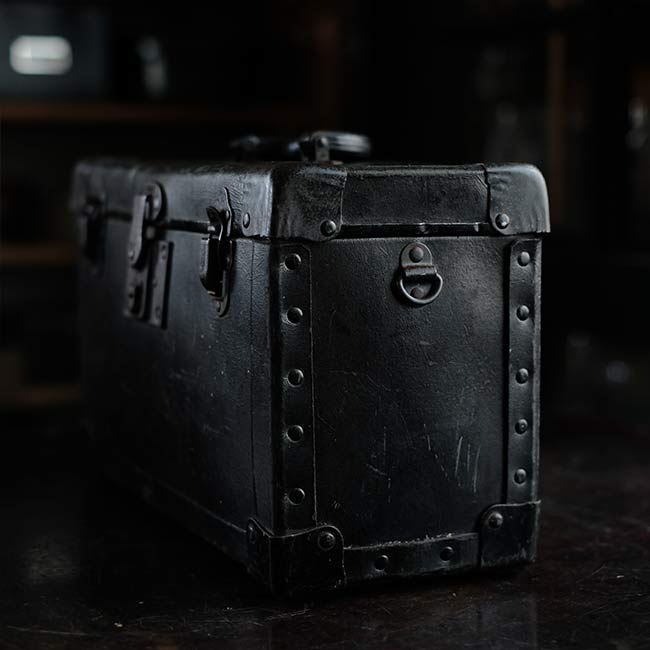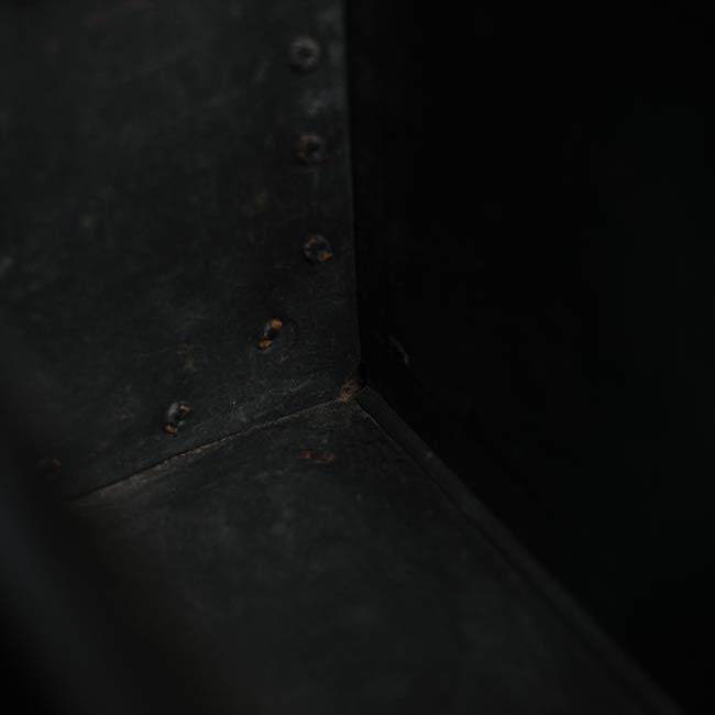 落としきれない汚れやくすみ等が残り、そこそこやれた雰囲気ではありますが、留め具はサビをある程度落とし、外側は全体を極少量の蜜蝋ワックスで磨きました。工具や文具、その他身の回りの様々な小物の収納に。