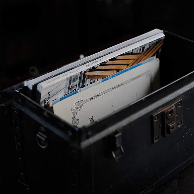 家具の仕上げ材のセットが収納されていたファイバー製ボックス(中身は残っておりません)。内部はトレー付きの二段になっていて、収納力高め。トレーを外した場合、横向きでA4だと頭が少し飛び出しますが、B5はすっぽり収まります。