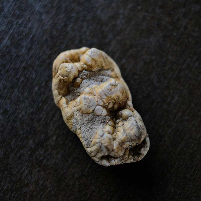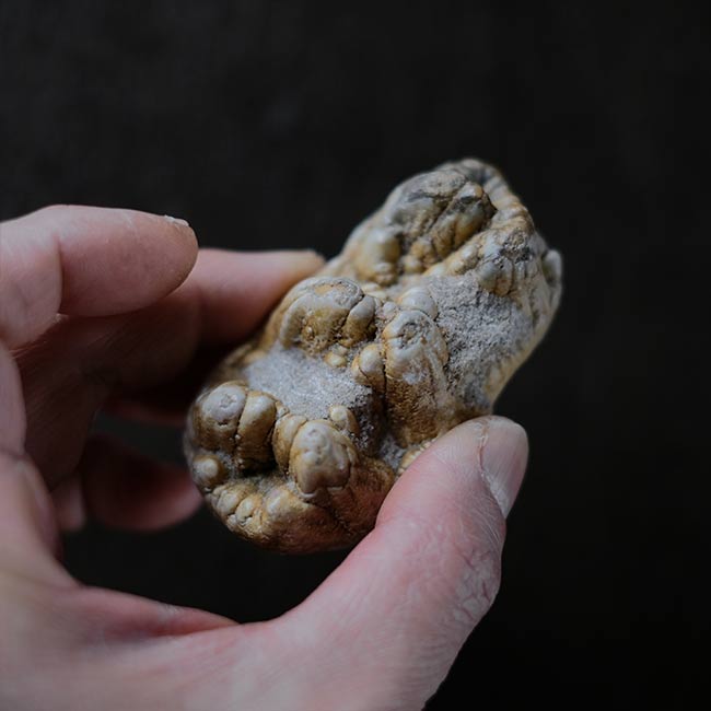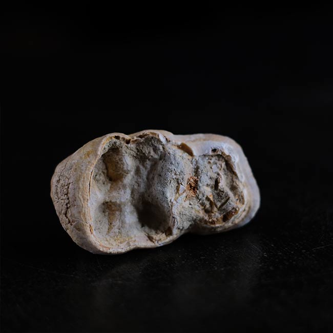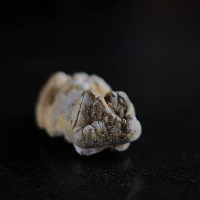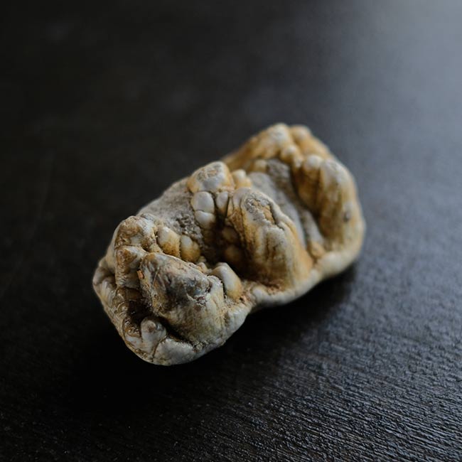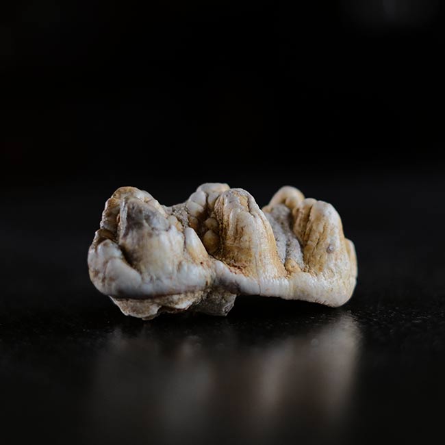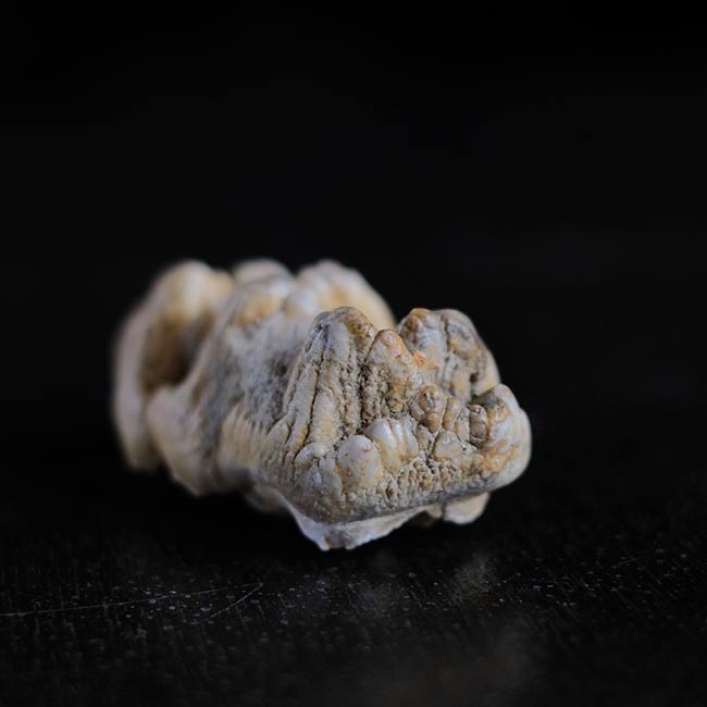 本品は長さ7.5cmほどの化石で、二列に並んだ突起(臼歯の咬頭)が特徴。突起は少しずつ摩耗してゆくので、この歯は若いゴンフォテリウムのものだったのかもしれません。