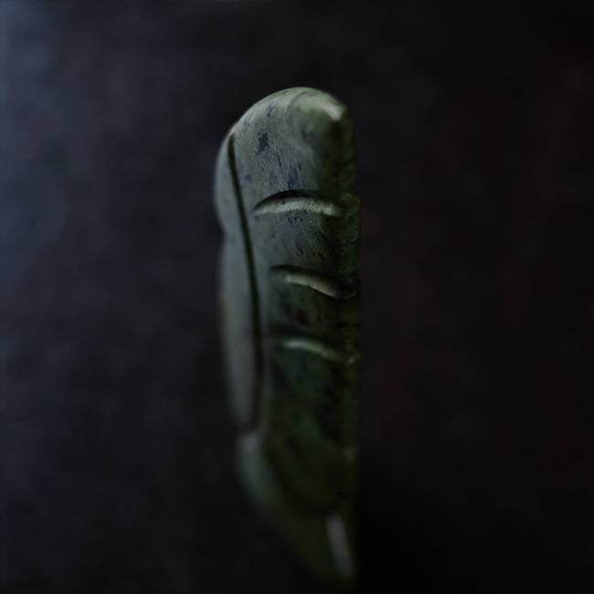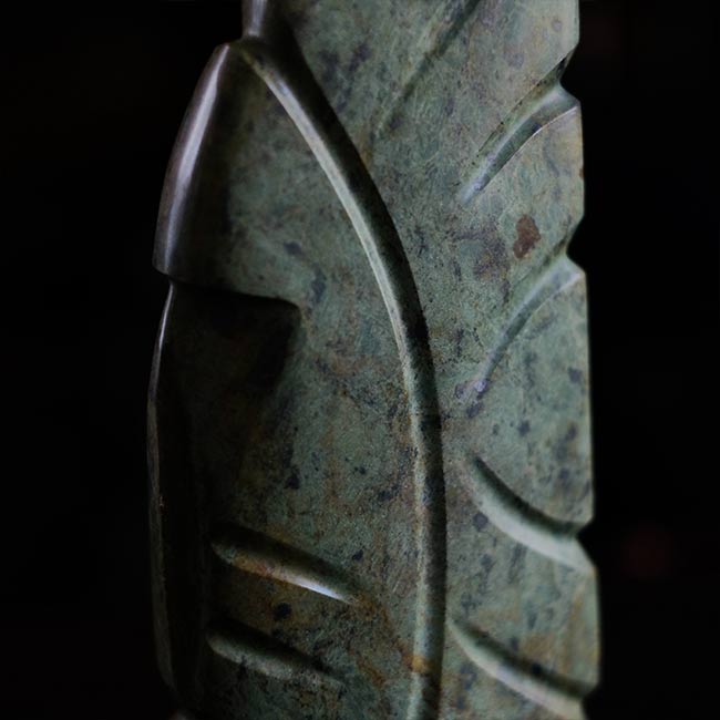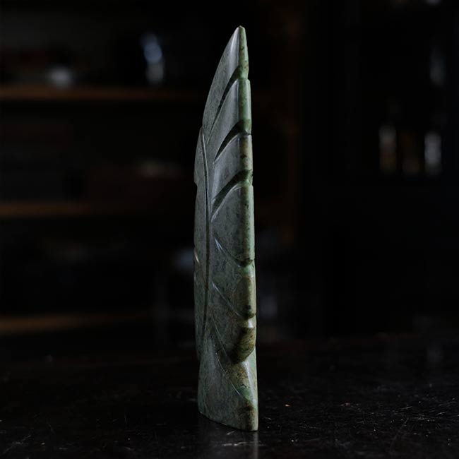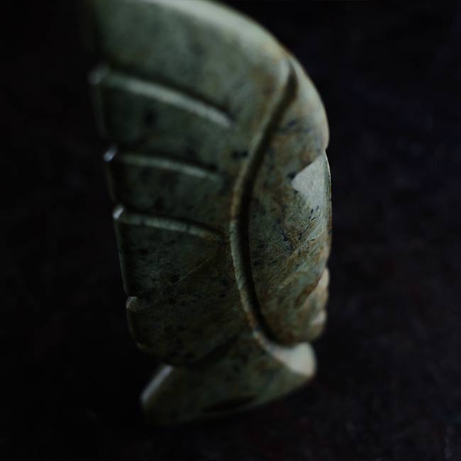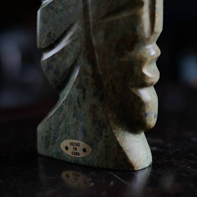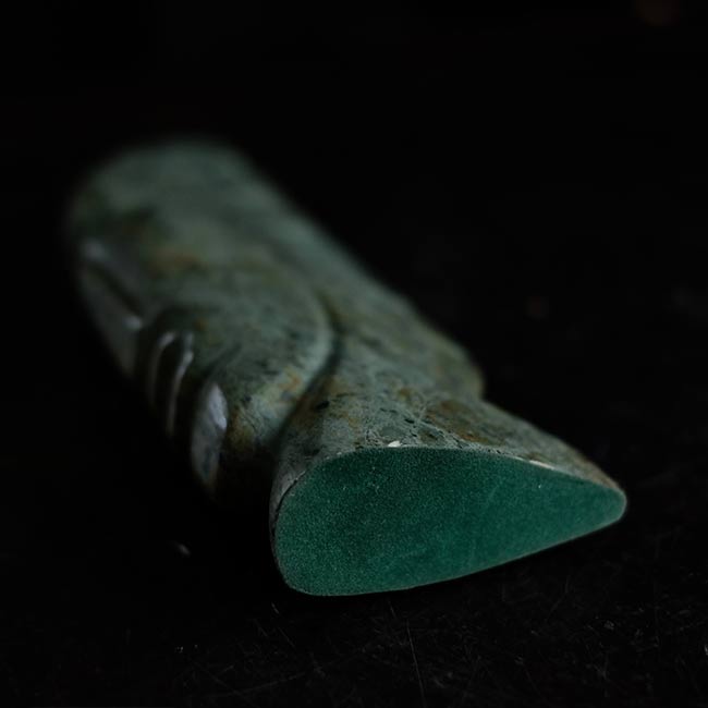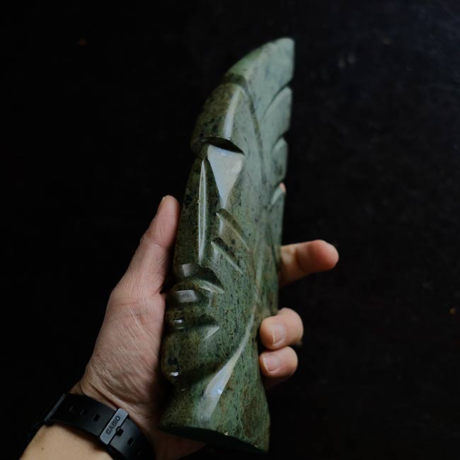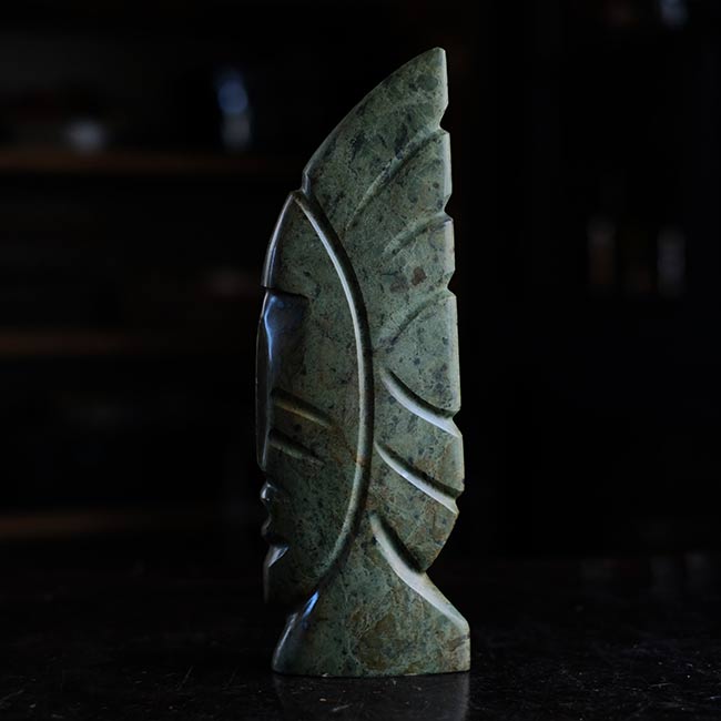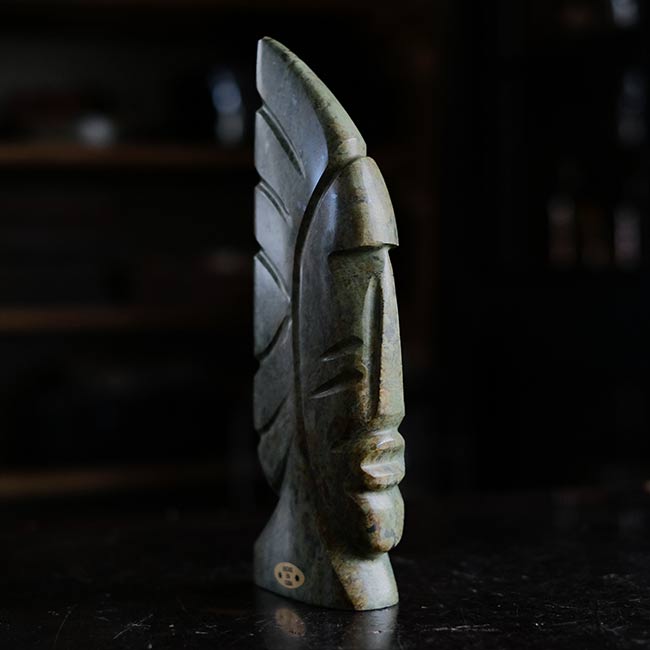 キューバ製のラベルが貼ってあるため、タノイ族か、もしくはネイティブアメリカンの彫像と思われます。ナイフのよう形をした特徴的なデフォルメで、素材はメノウかジャスパーでしょうか。緑がベースですが、そこにグレーやオレンジなどが様々な模様で入っております。